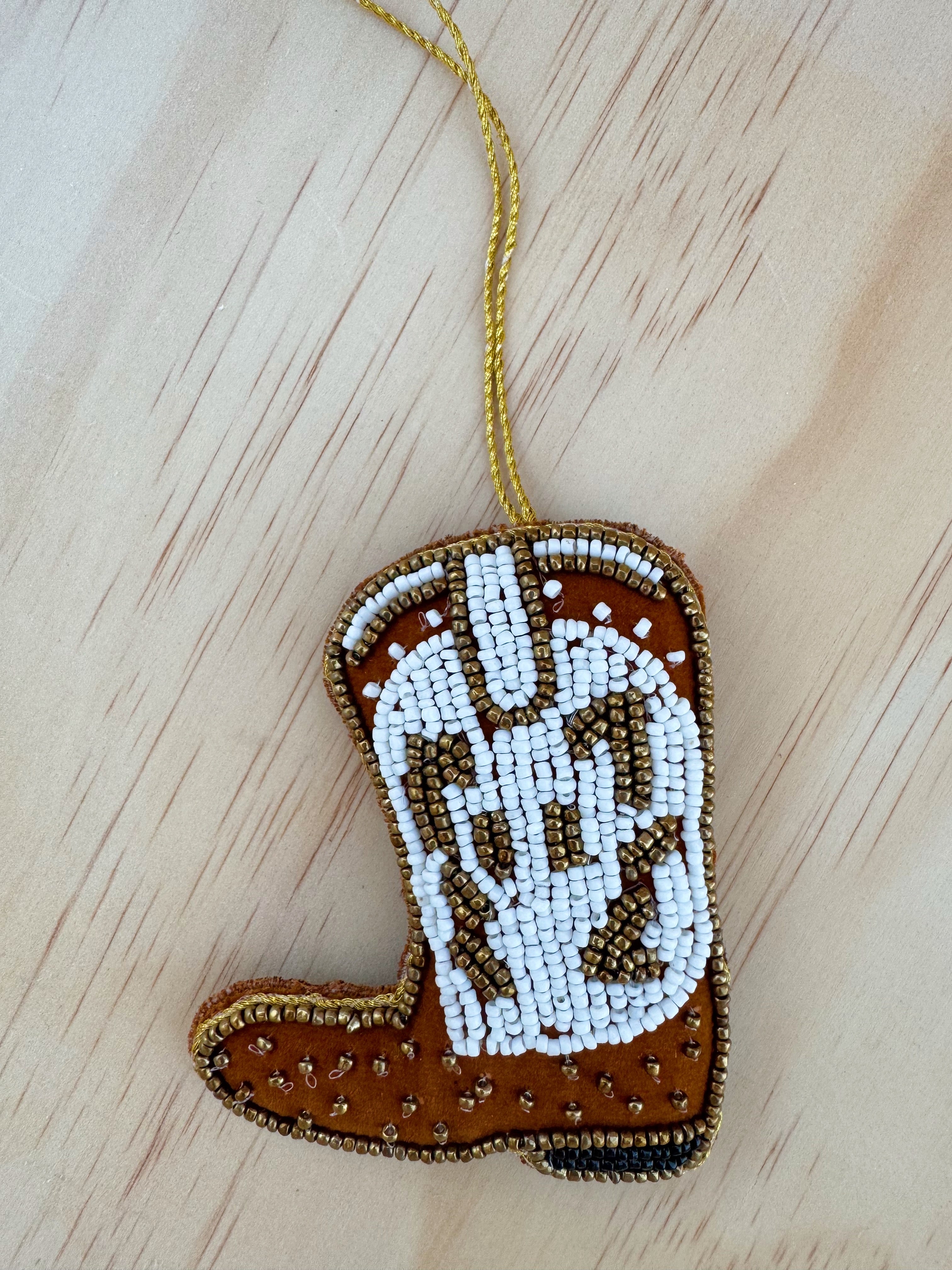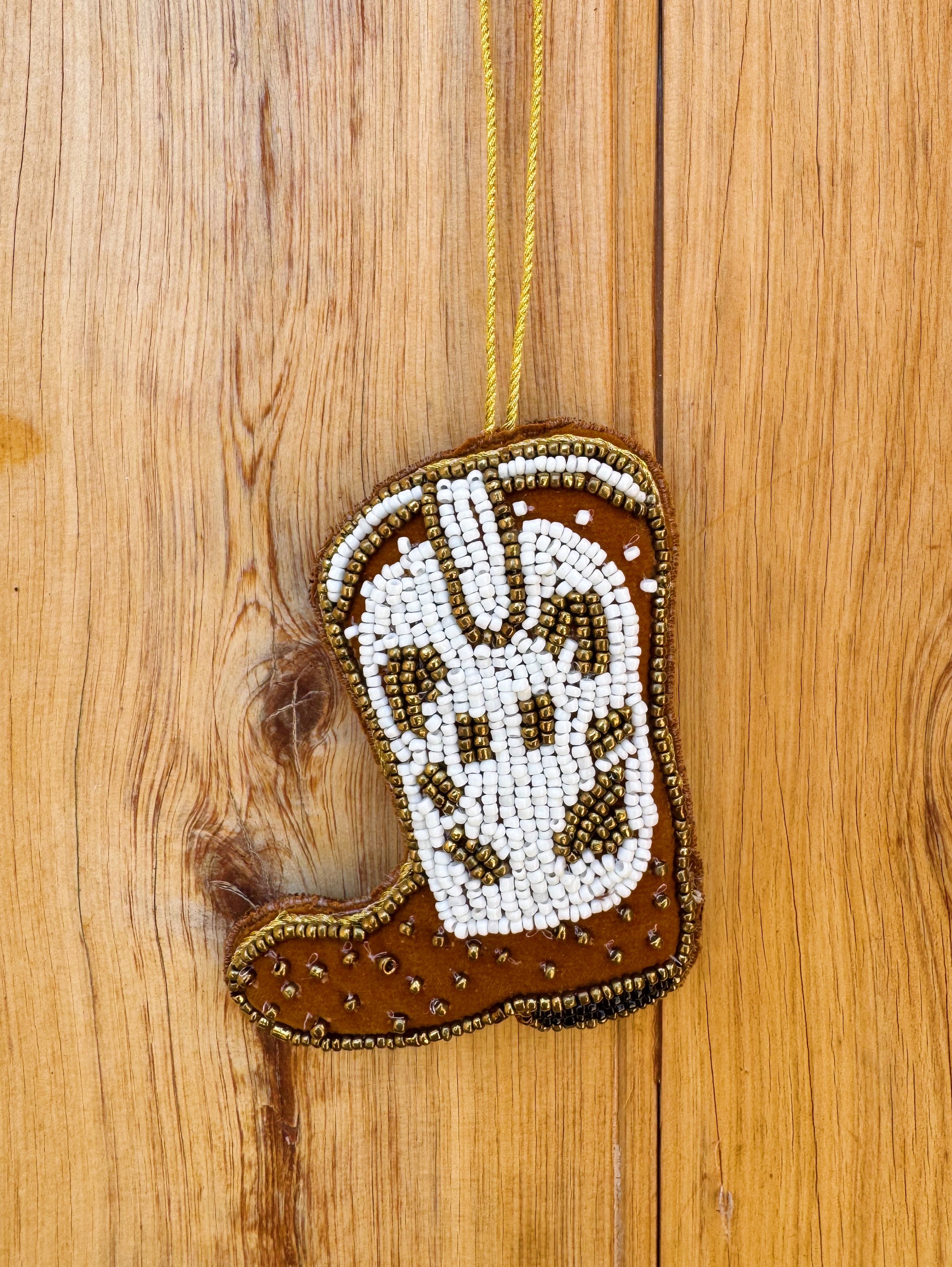 Add a touch of western charm with this playful beaded brown cowboy boot decoration. Handmade by skilled artisans, it features a detailed front and a plain brown back for a classic look. The strong gold rope makes it easy to hang anywhere you want to show off a bit of cowboy spirit. Perfect for adding fun flair to your space!