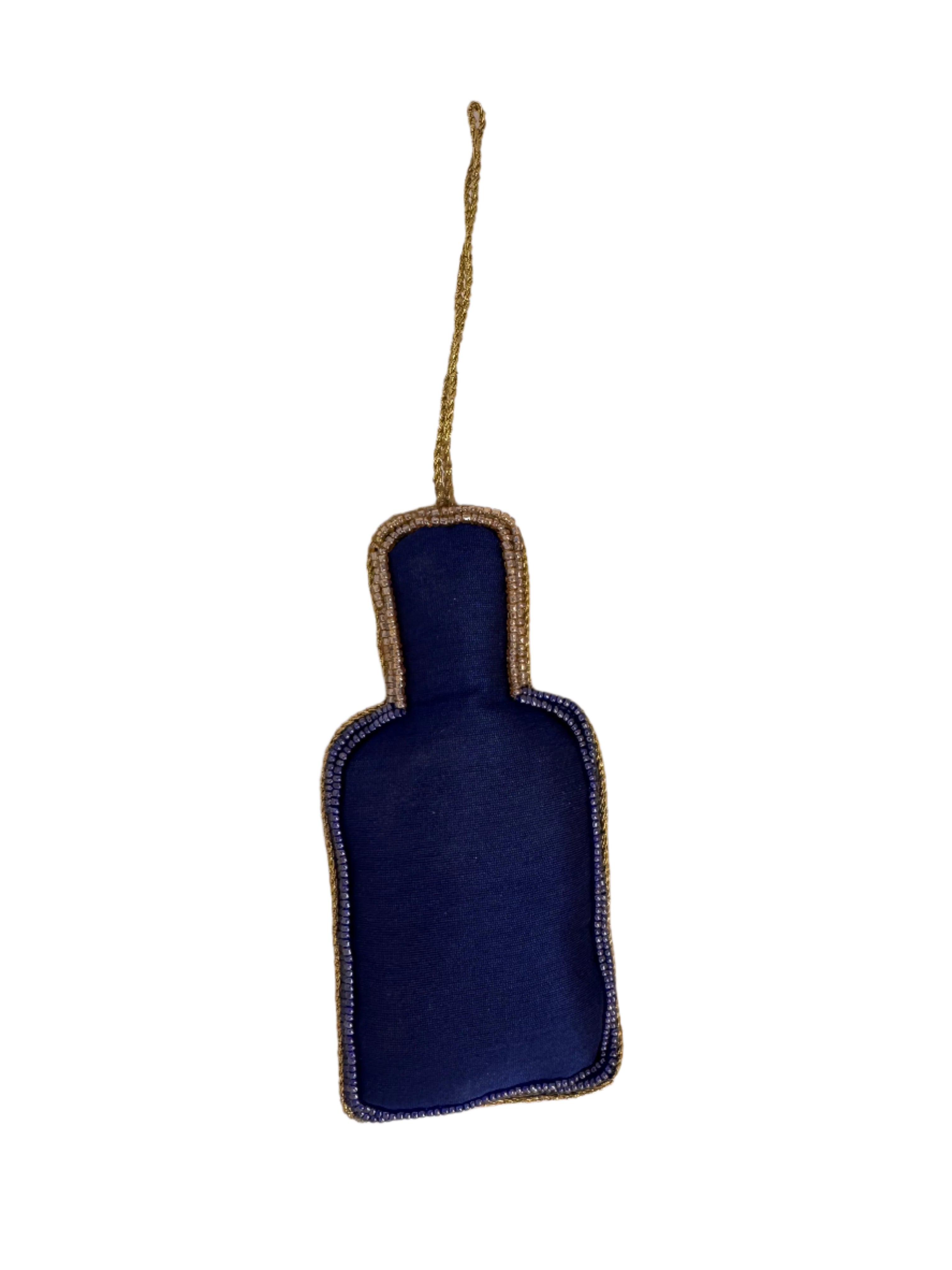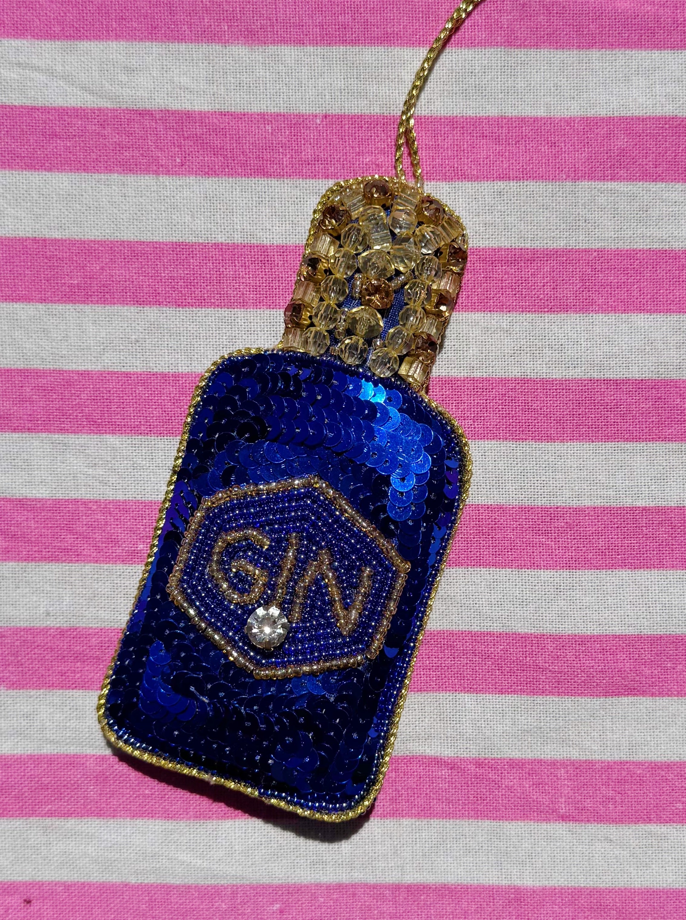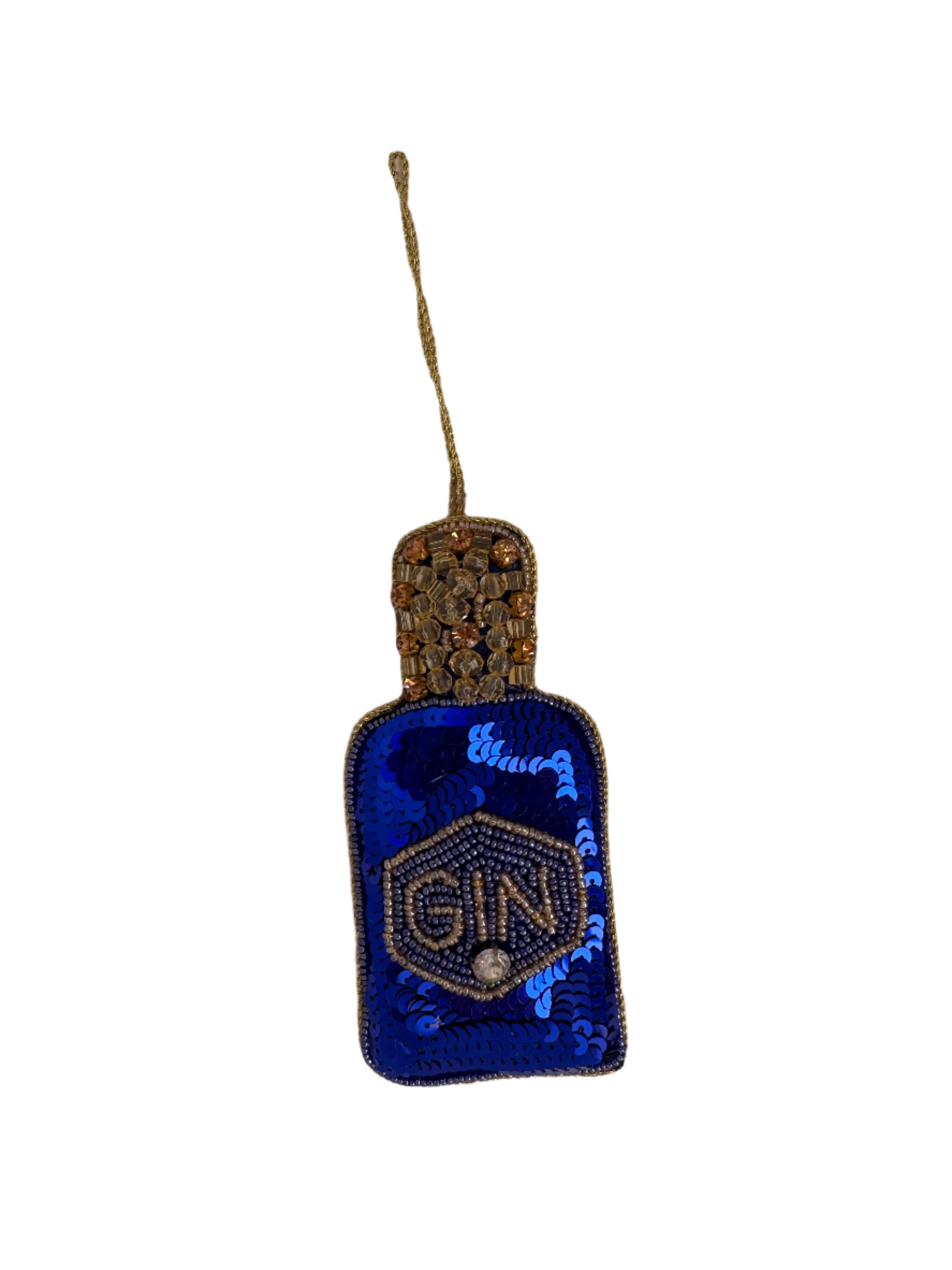 Celebrate the festive season with this playful Gin Sequin Christmas Decoration! Sparkling in bright sapphire blue, it’s beaded and sequined to catch the sun’s rays beautifully. Measuring 13x6.5cm, it hangs from a twisted gold rope cord against a plain blue fabric back, adding a fun and shimmering touch to your holiday décor.