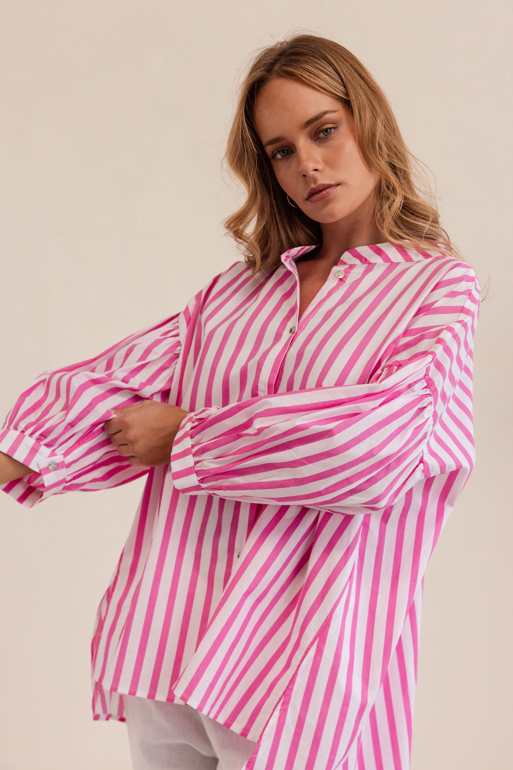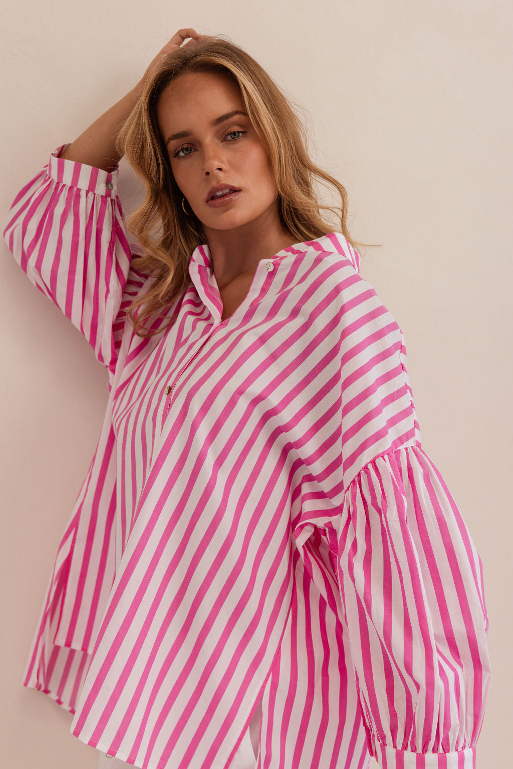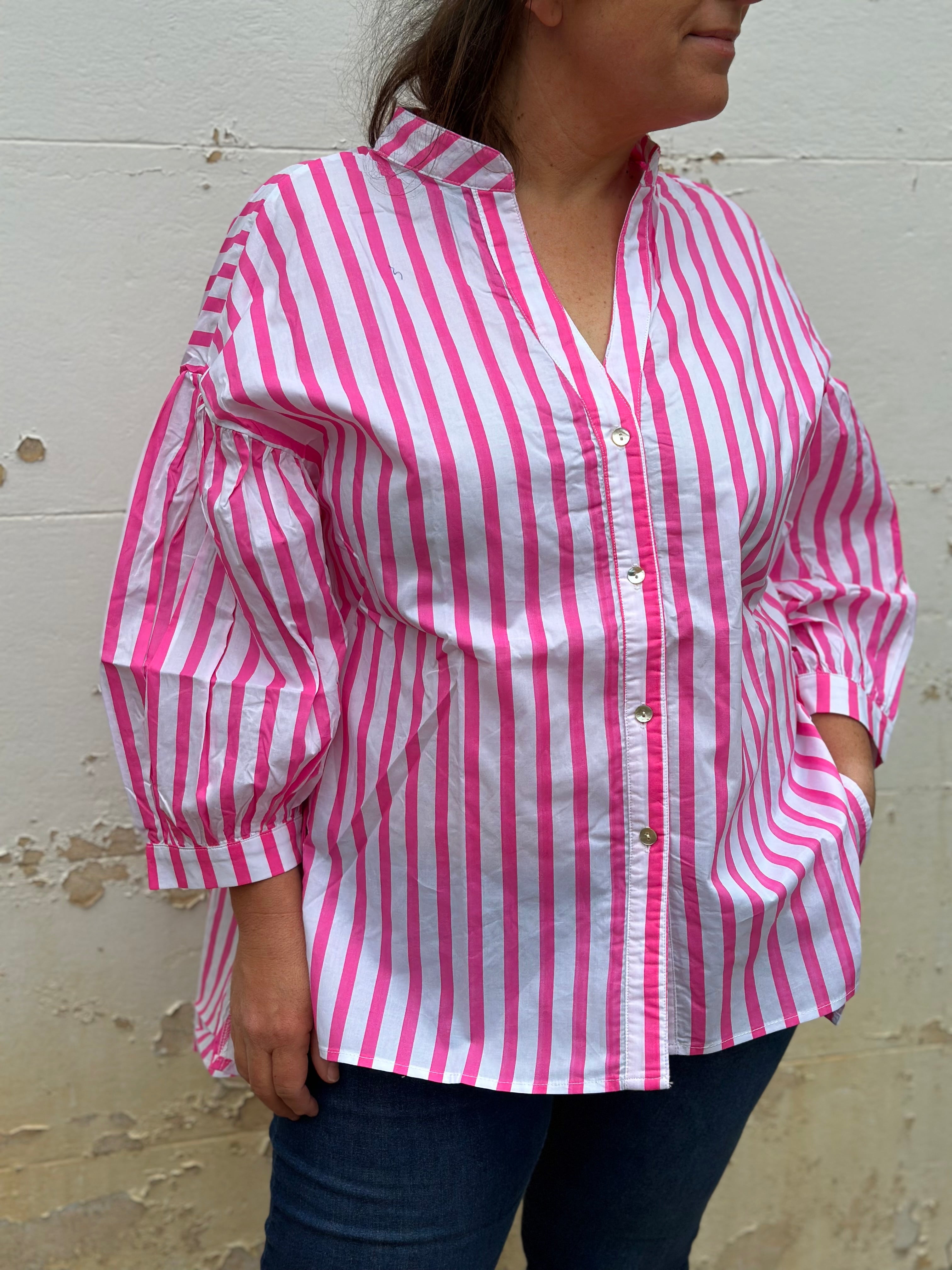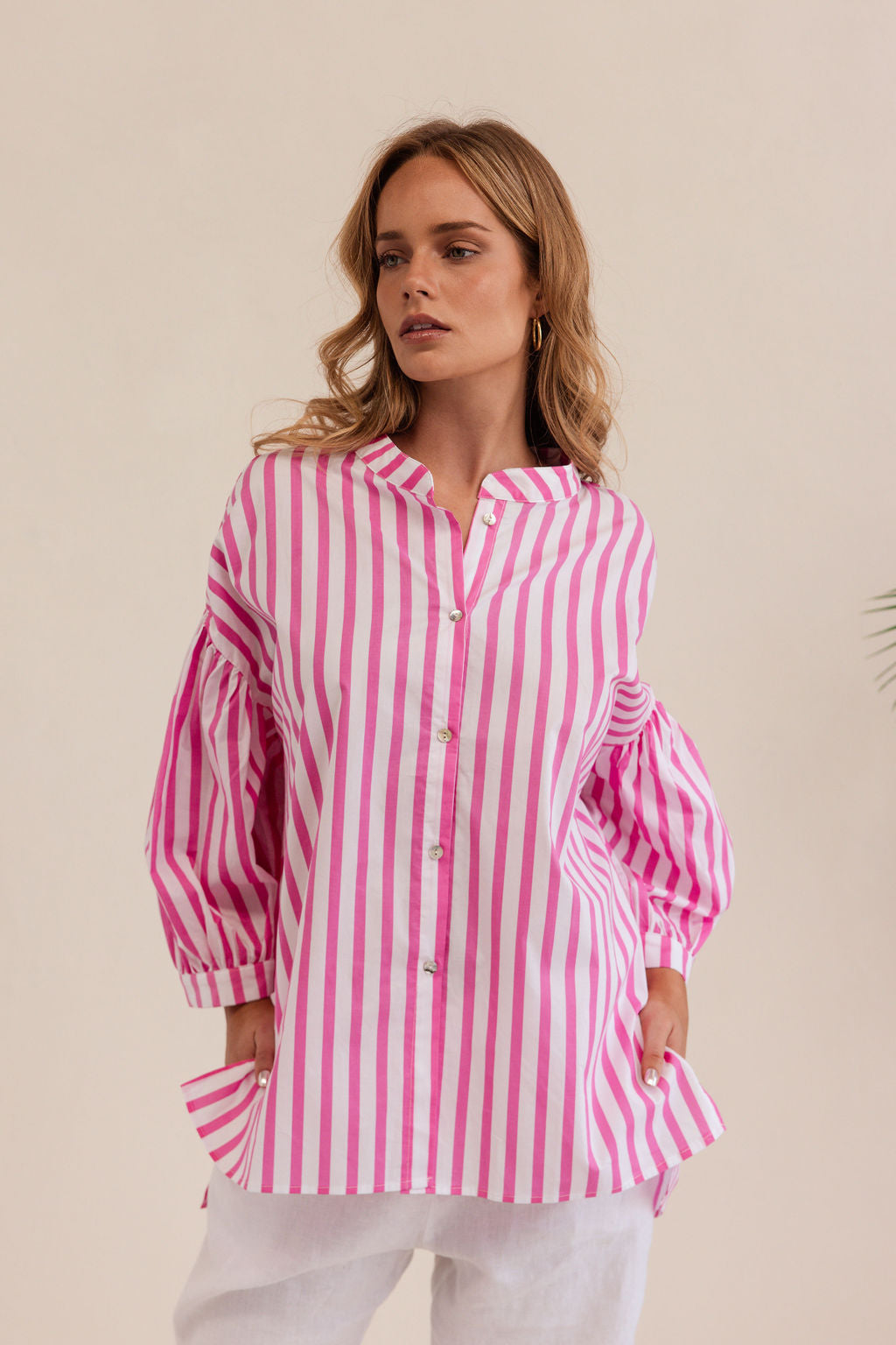 Embrace a splash of fun with this 100% Cotton Gathered Sleeve Shirt, featuring charming pink stripes that brighten any outfit. Soft, breathable cotton keeps you comfy all day, while the gathered sleeves add a flirty twist to your look. Perfect for playful days and stylish adventures!