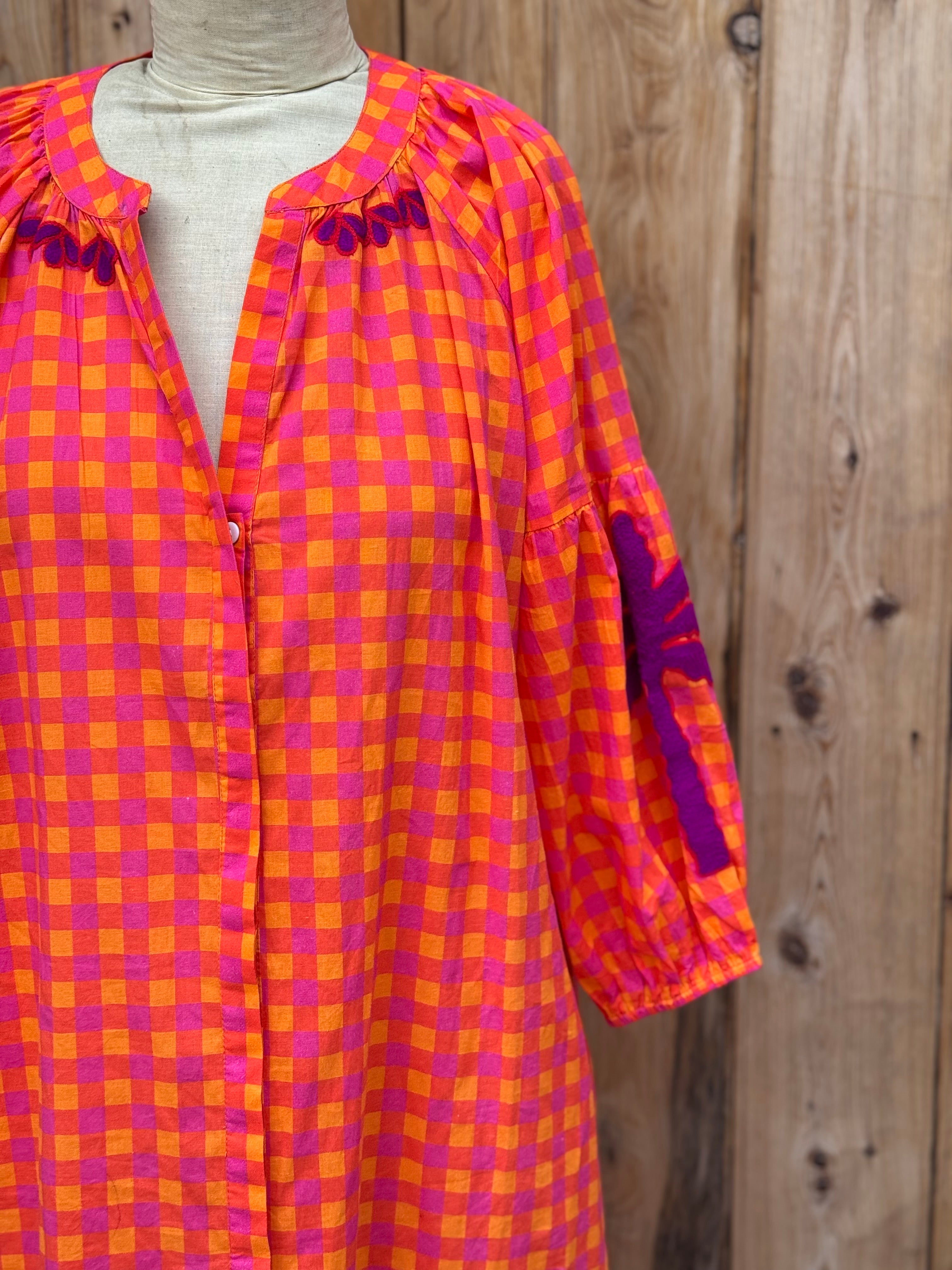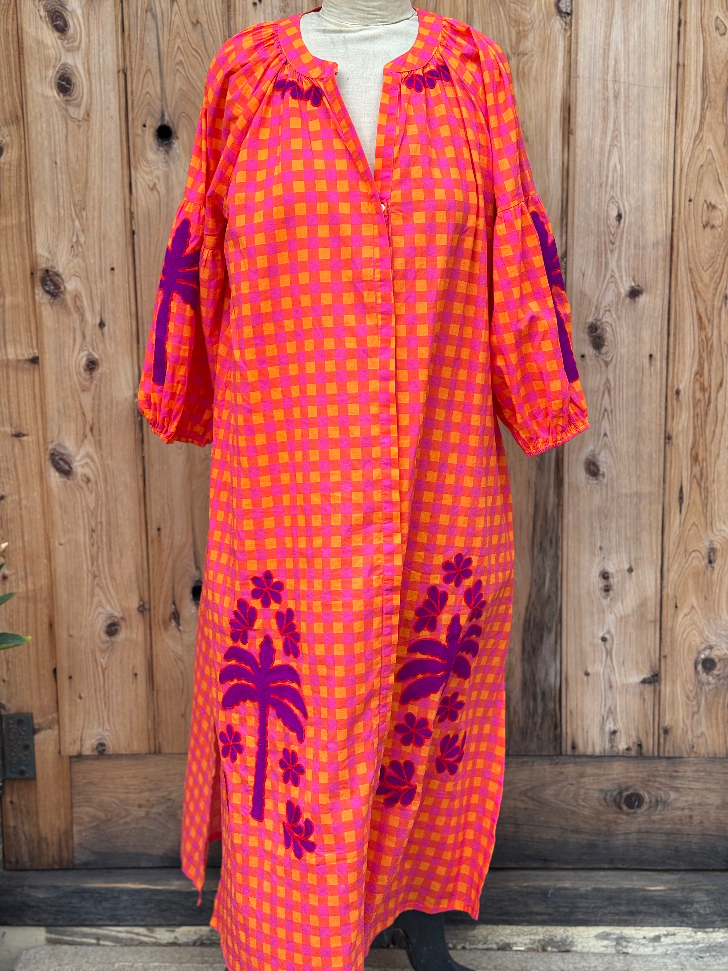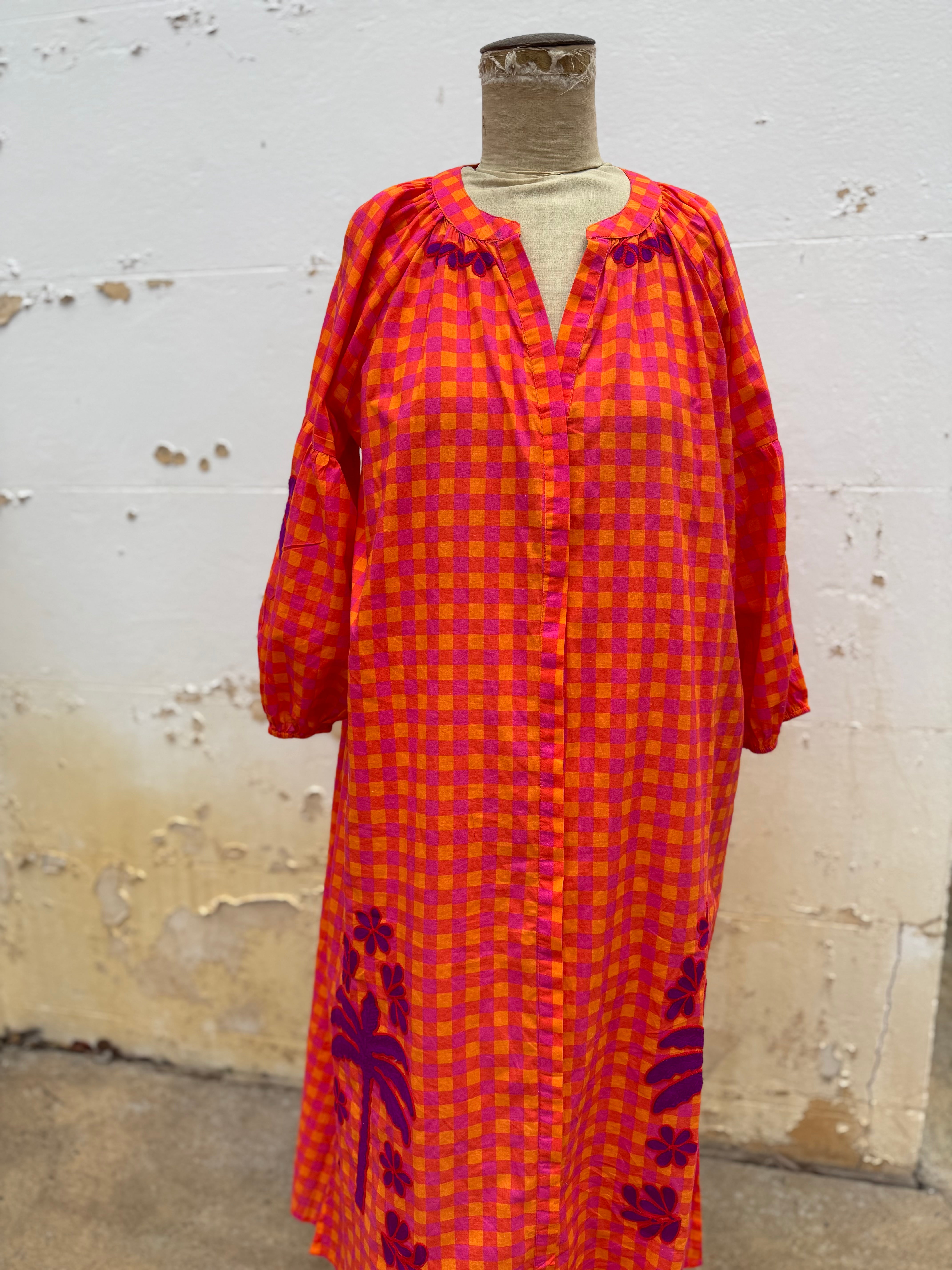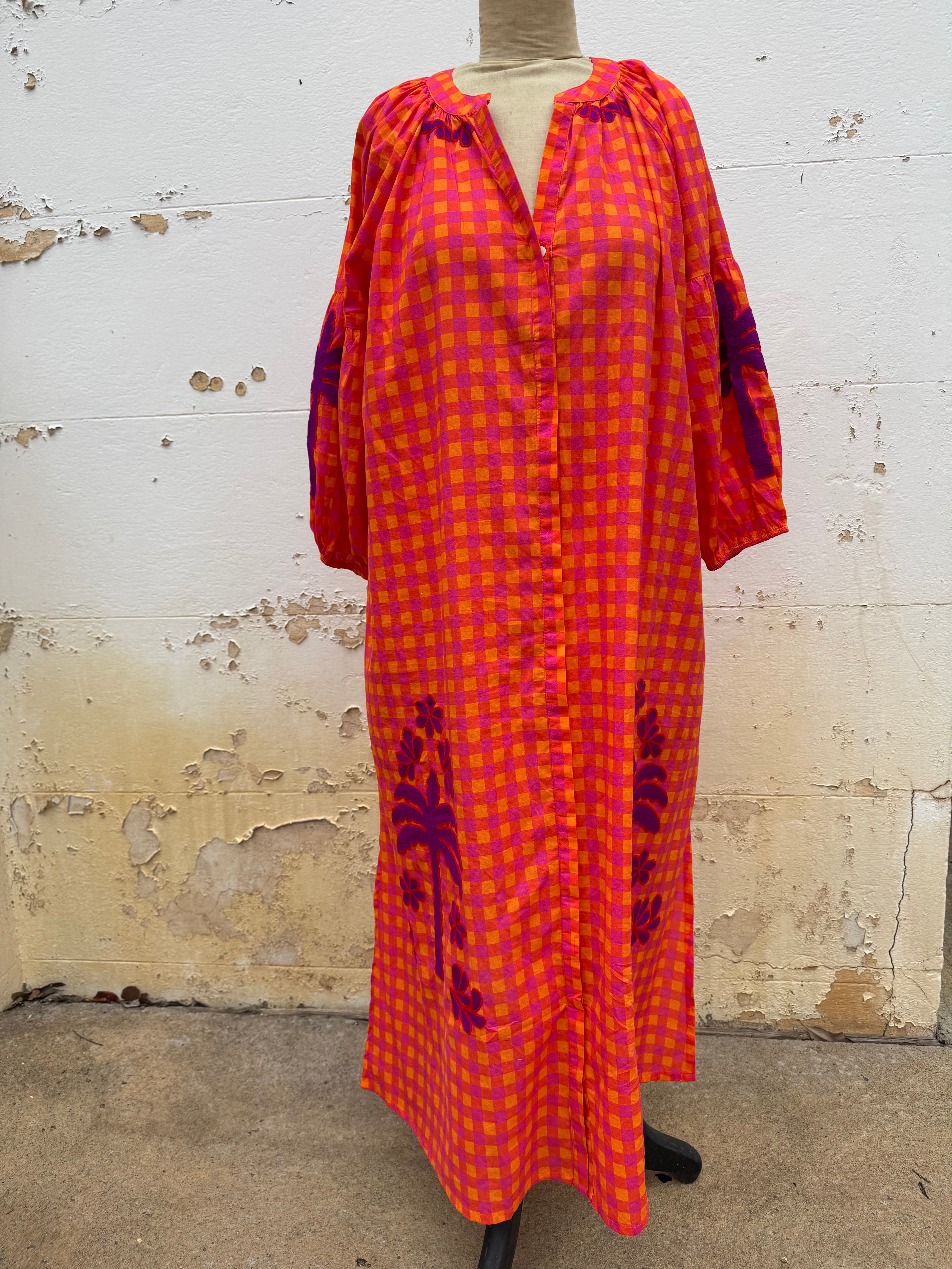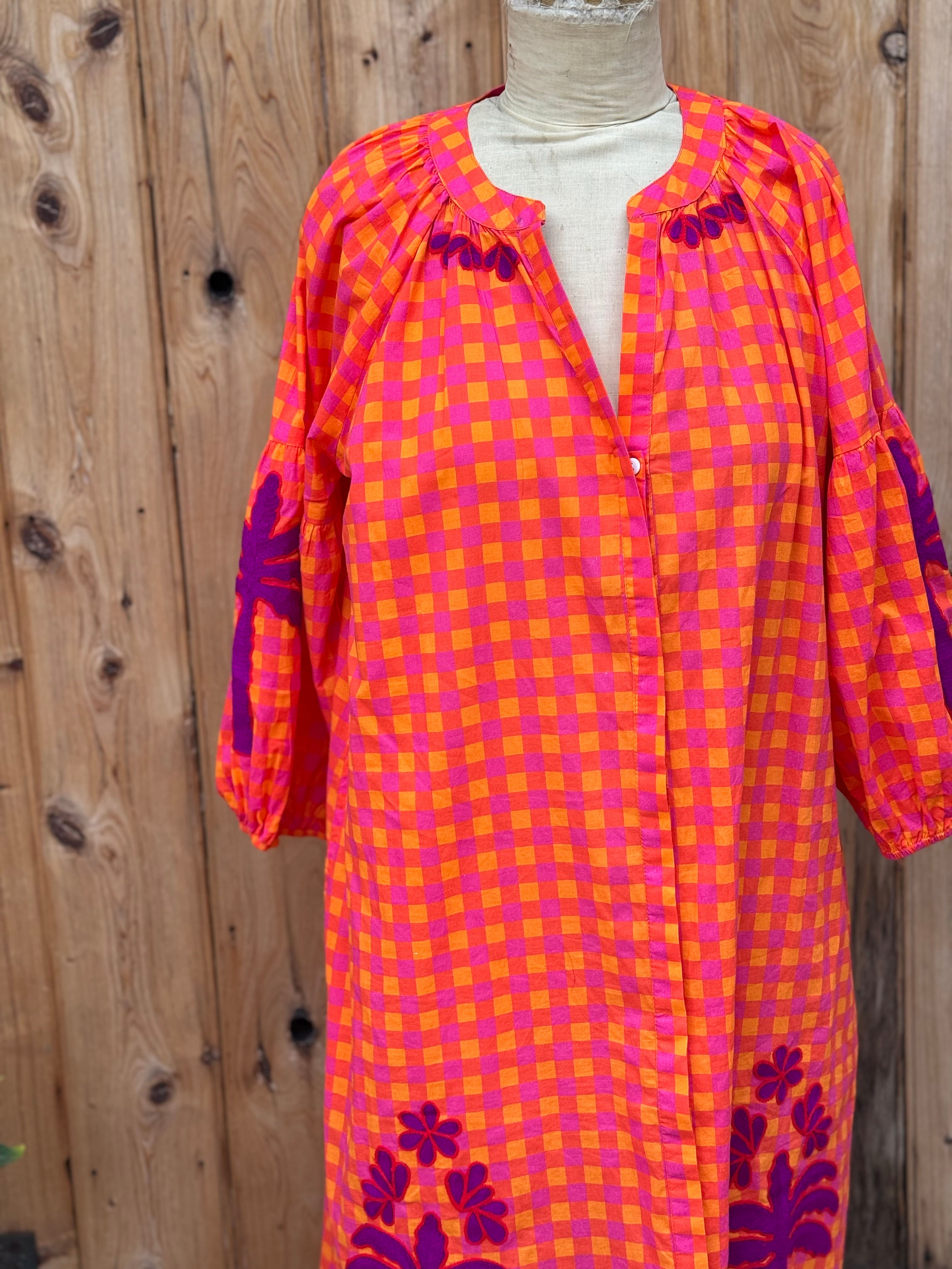 Step into vibrant style with this playful cotton maxi dress in bright orange, pink and red hues. Delightful purple embroidery decorates the sleeves, collar, and hem, adding a whimsical touch. Featuring a round neckline, button-front closure, and elastic cuffs on 3/4 length sleeves, it combines comfort with fun flair for sunny days and festive occasions. Available in three sizes.