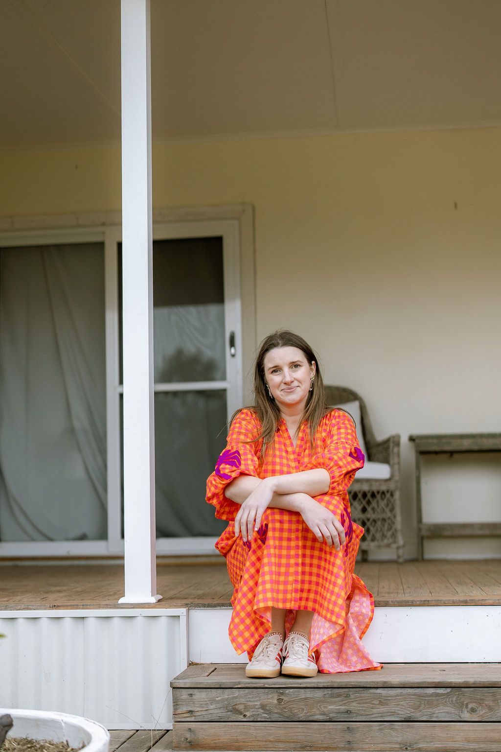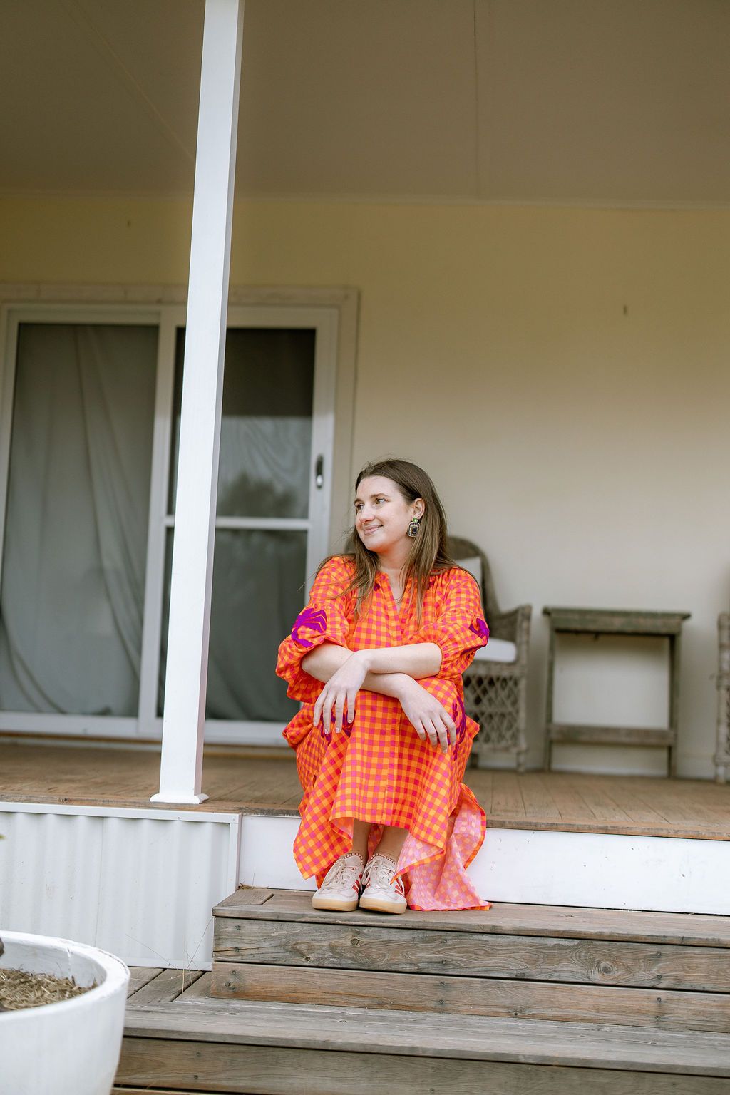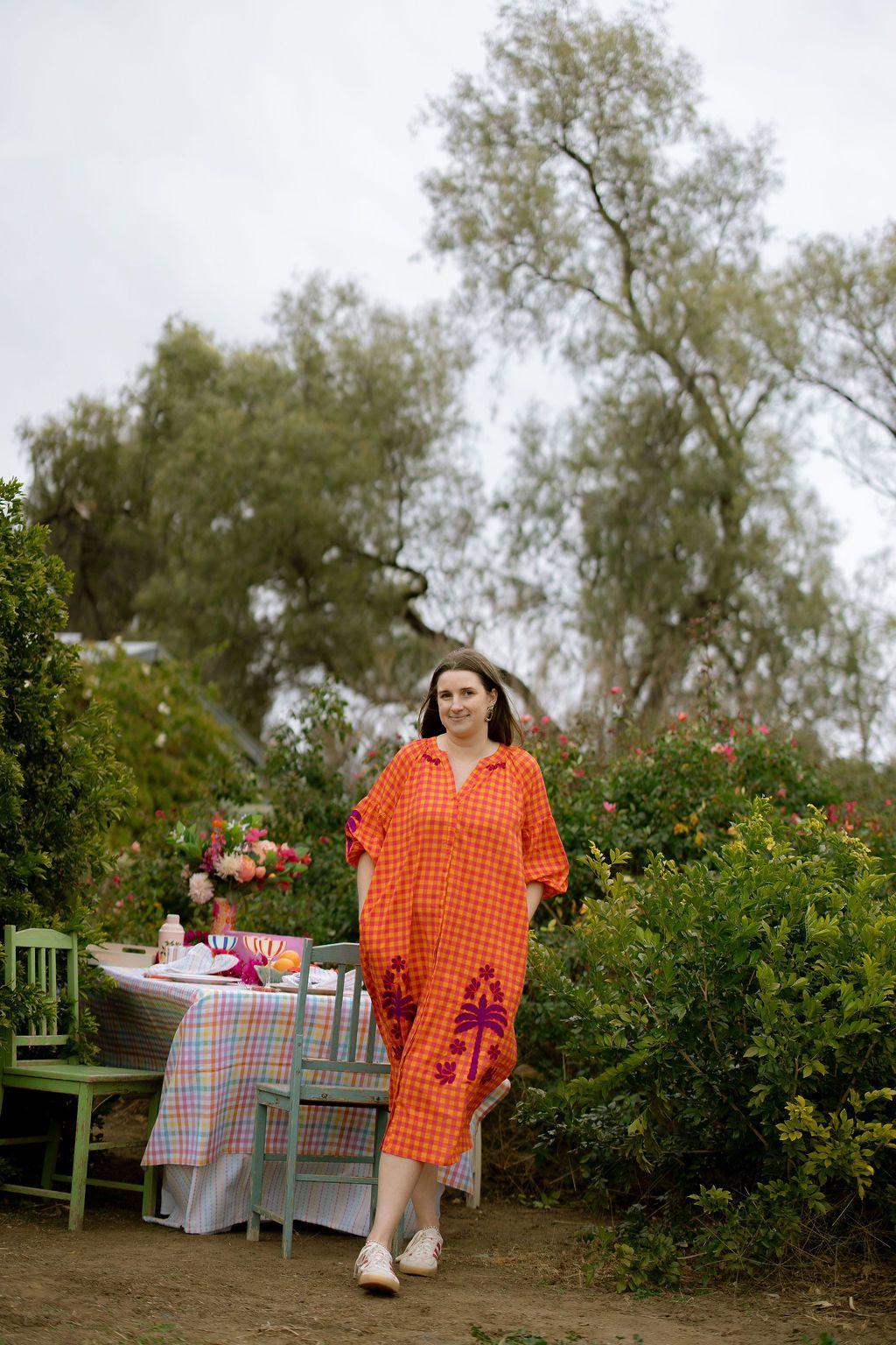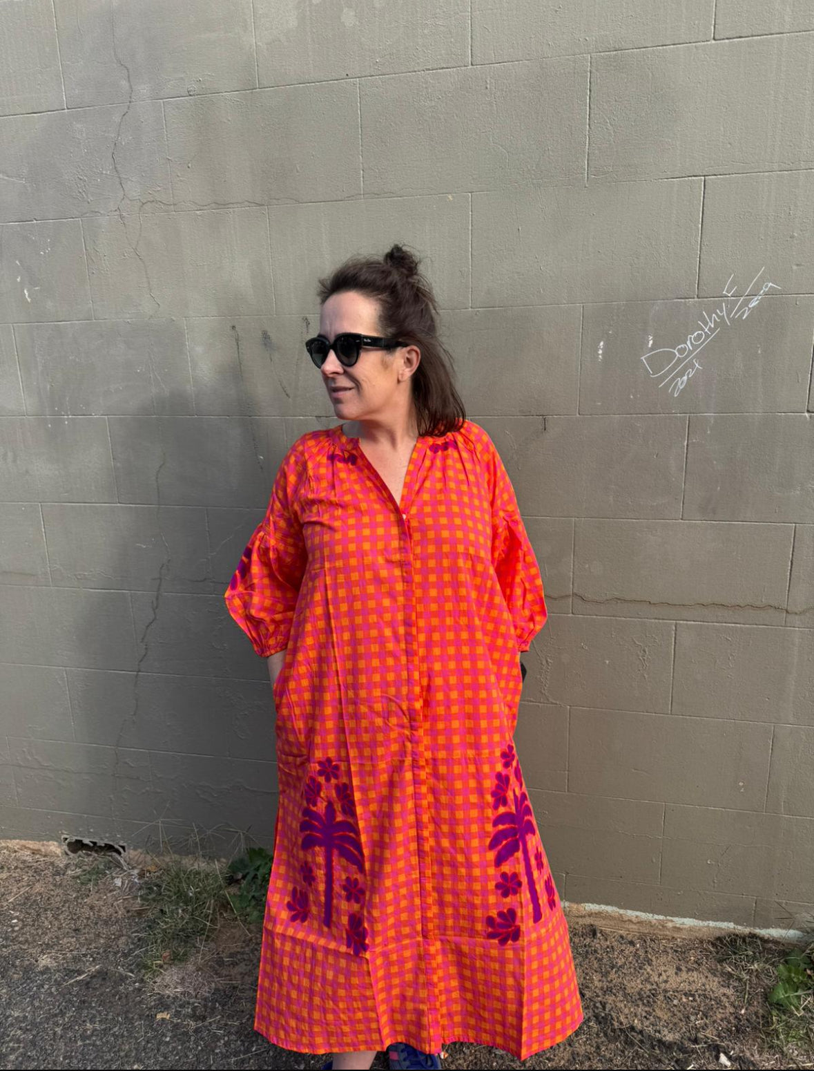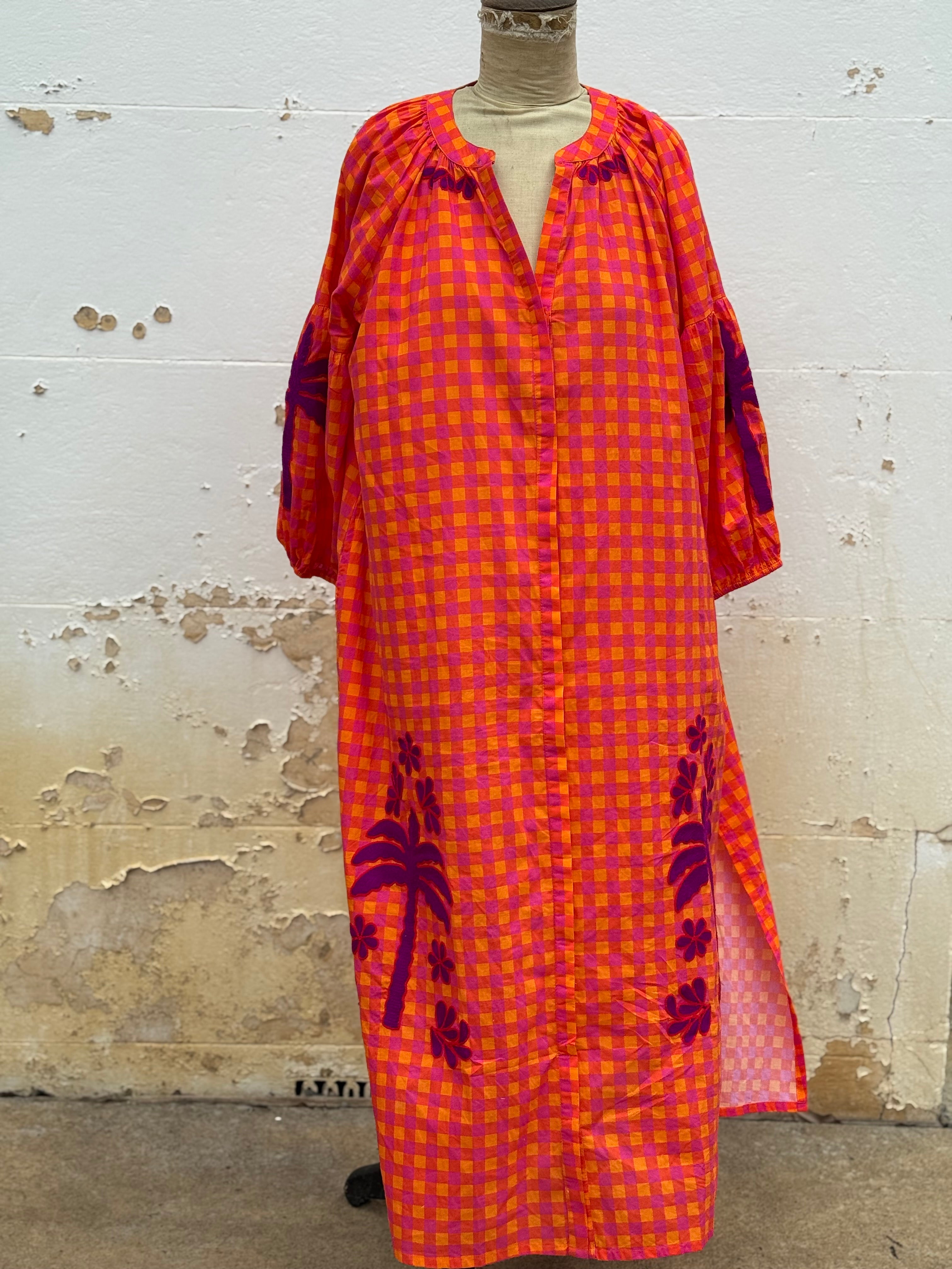 Step into vibrant style with this playful cotton maxi dress in bright orange, pink and red hues. Delightful purple embroidery decorates the sleeves, collar, and hem, adding a whimsical touch. Featuring a round neckline, button-front closure, and elastic cuffs on 3/4 length sleeves, it combines comfort with fun flair for sunny days and festive occasions. Available in three sizes.