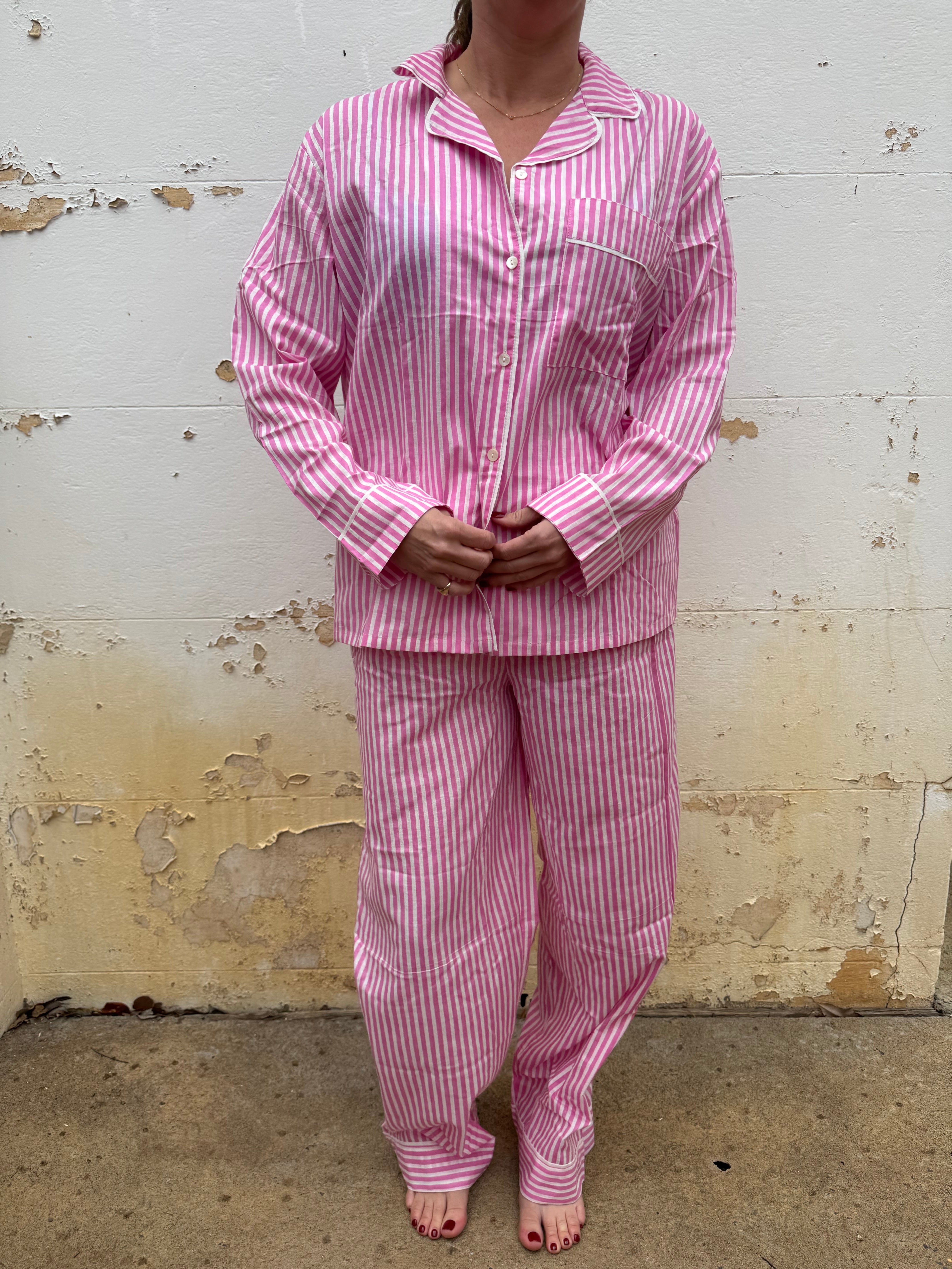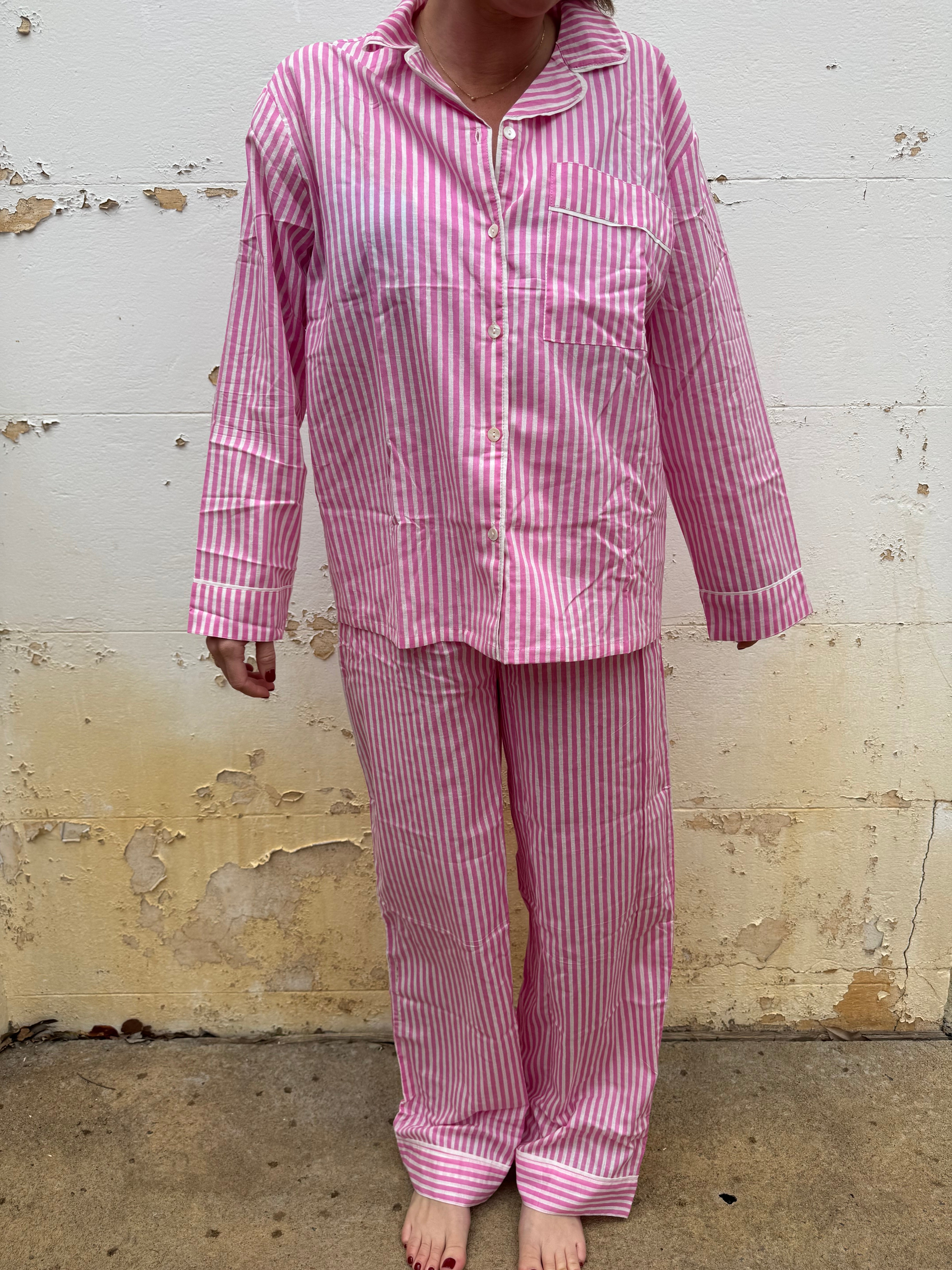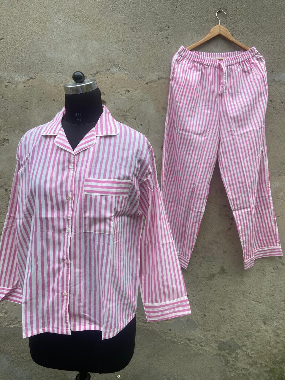 Enjoy bedtime in style with the Pink Stripe Cotton Pyjamas Set. This playful set features a collared shirt with a pocket and cuffs, paired with long pants that have an elastic waist and ankle cuffs for a comfy, loose fit. Made from soft cotton, it’s perfect for relaxing nights and comes in a matching drawstring gift bag—ideal for gifting. Available in sizes S (8-10), M (10-12), and L (12-14), it’s a cozy treat you’ll love to wear.