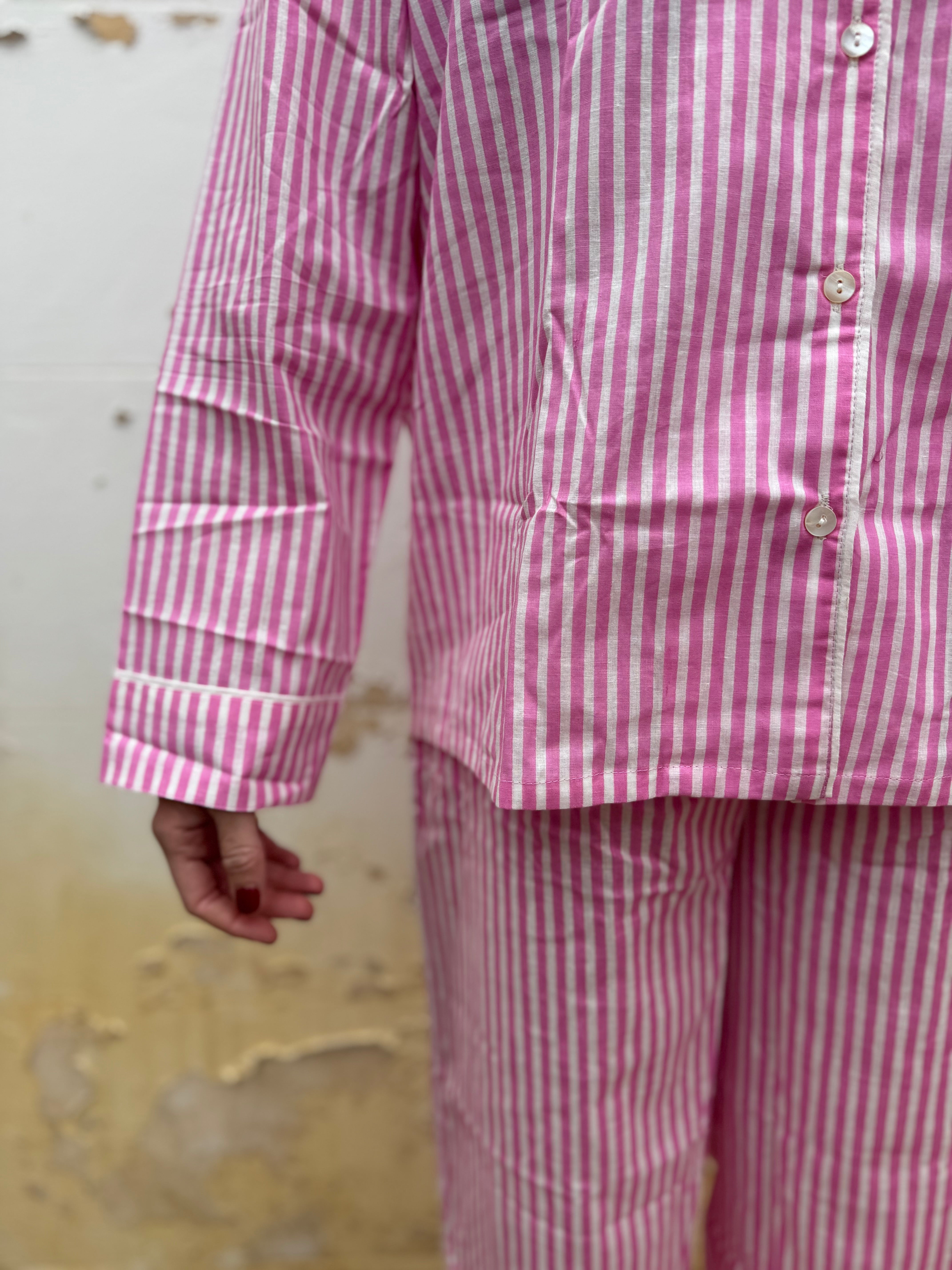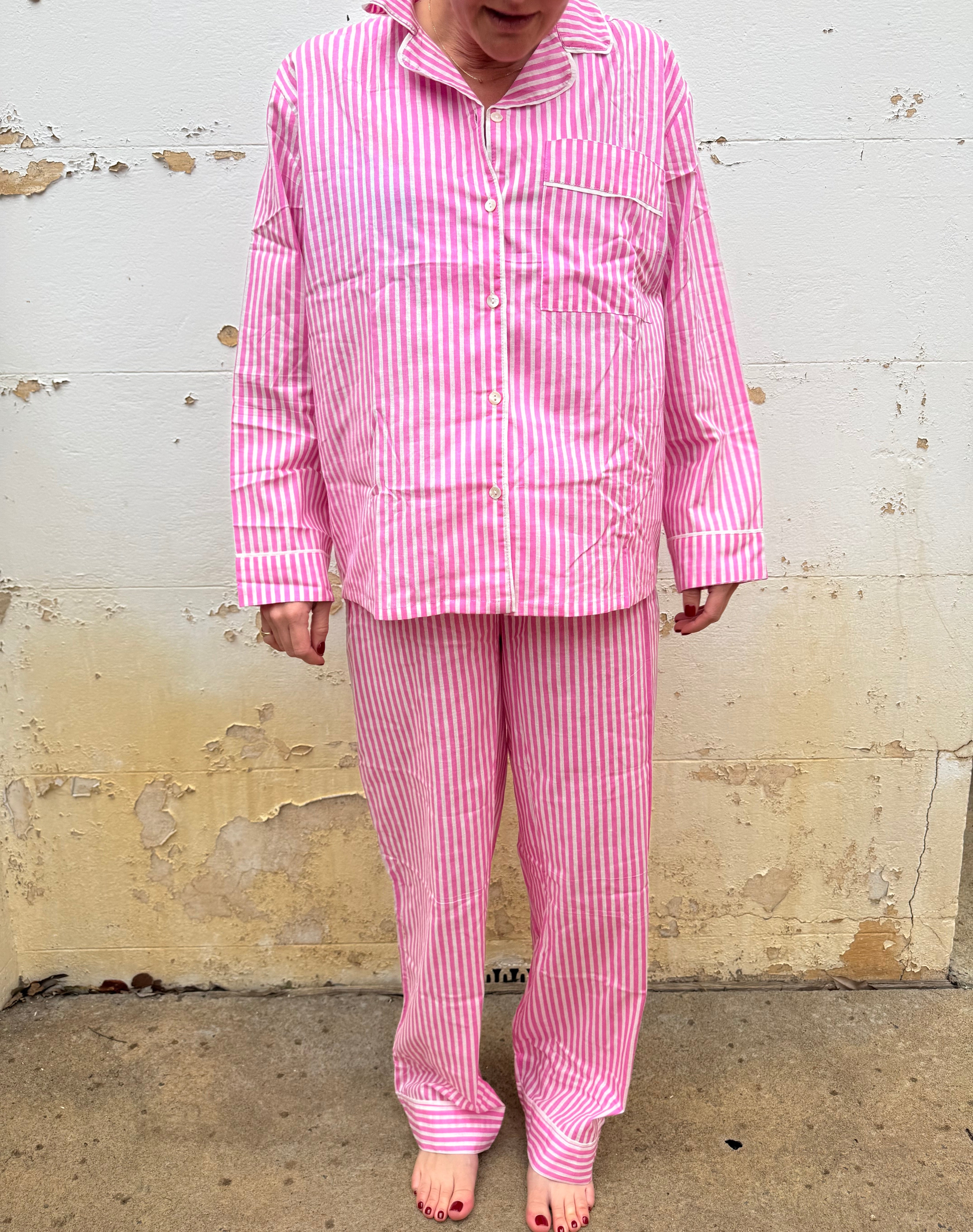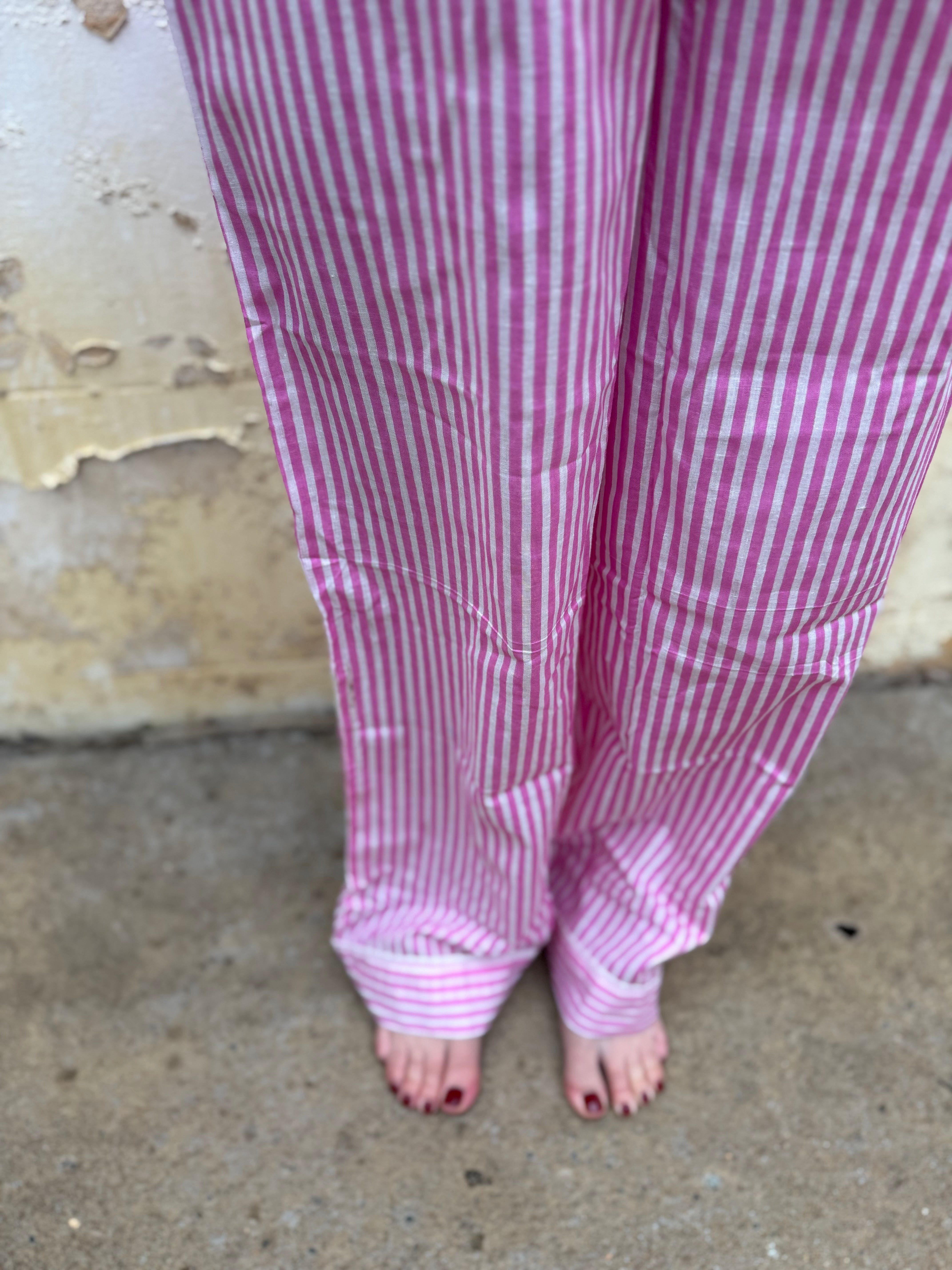 Enjoy bedtime in style with the Pink Stripe Cotton Pyjamas Set. This playful set features a collared shirt with a pocket and cuffs, paired with long pants that have an elastic waist and ankle cuffs for a comfy, loose fit. Made from soft cotton, it’s perfect for relaxing nights and comes in a matching drawstring gift bag—ideal for gifting. Available in sizes S (8-10), M (10-12), and L (12-14), it’s a cozy treat you’ll love to wear.