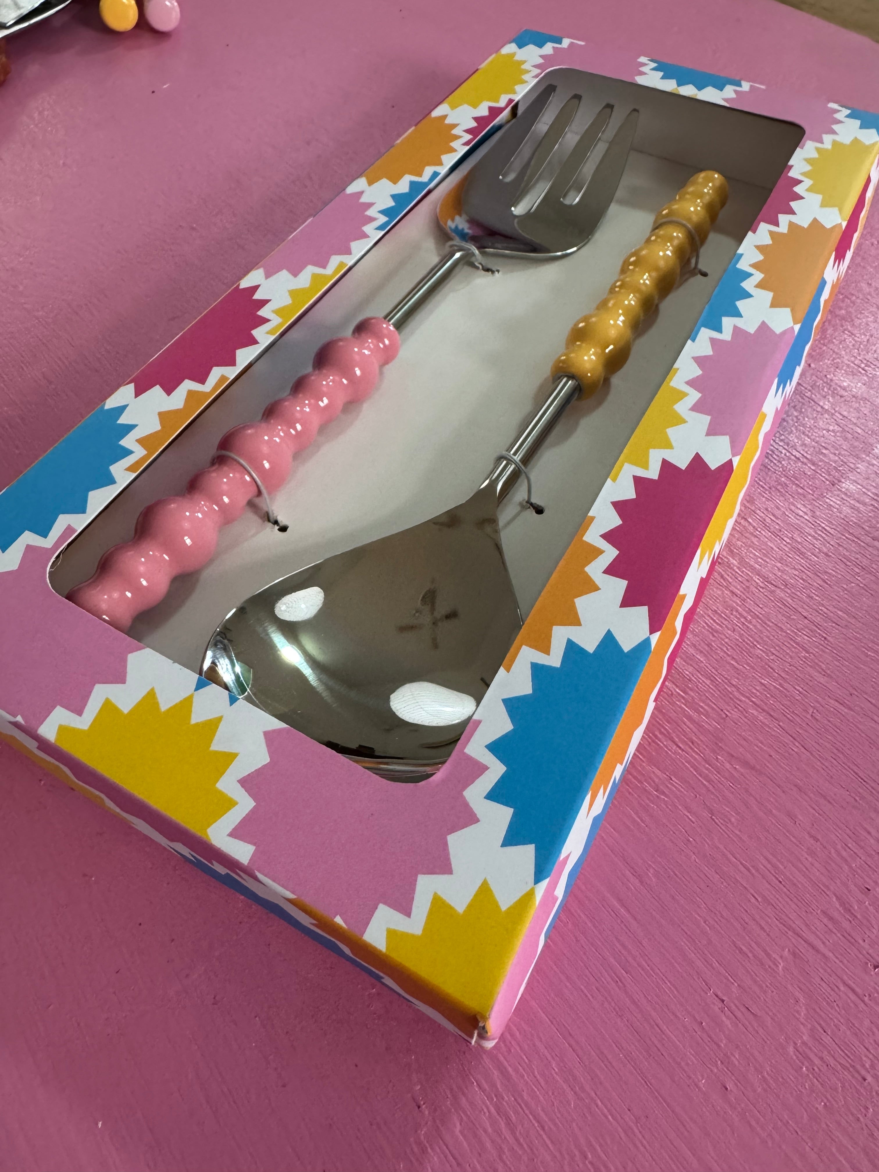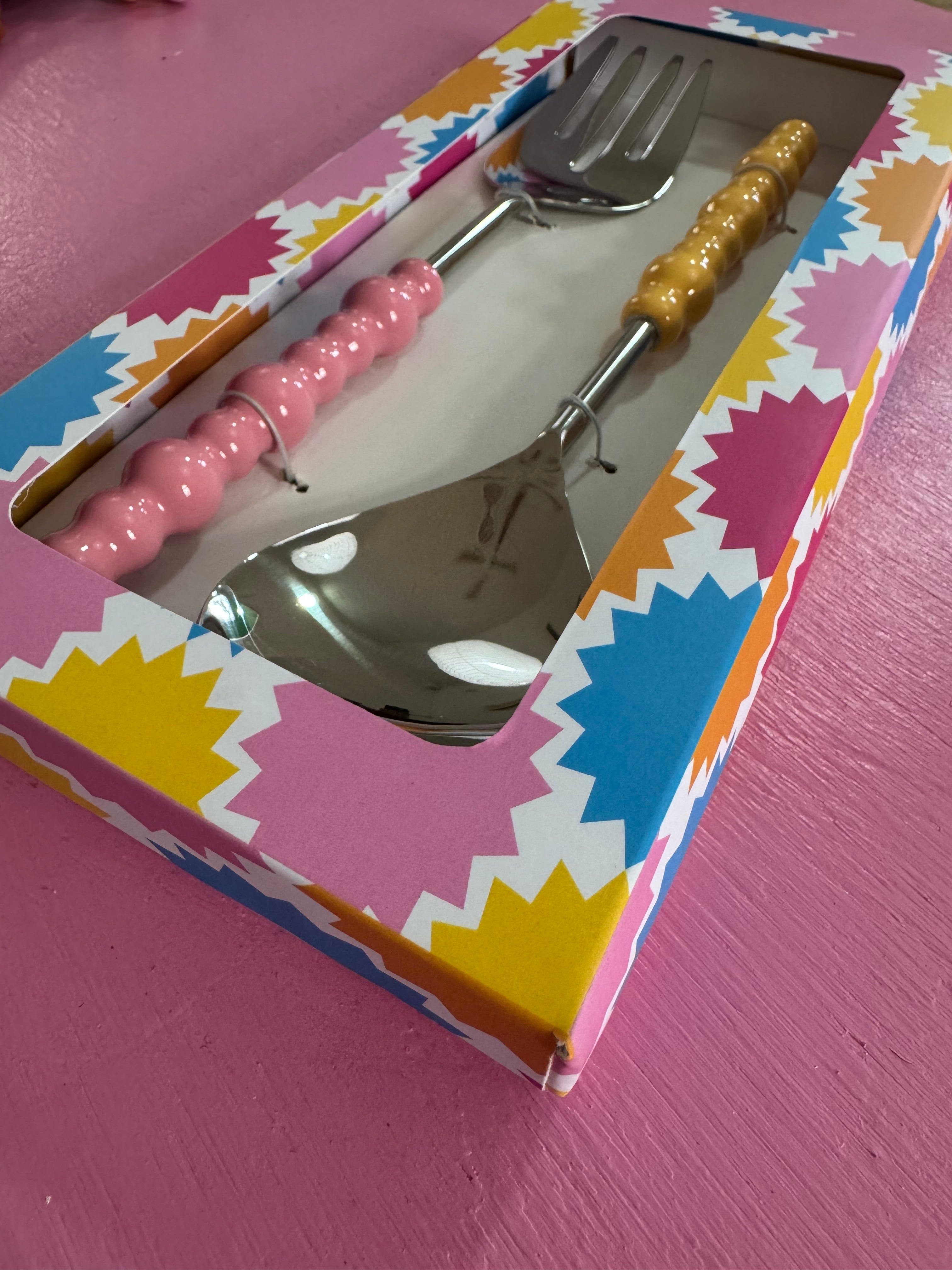 Add a splash of fun to your dining with the Pastel Pop Salad Servers. Measuring 28cm by 7cm, these servers showcase hand-painted pastel pink and yellow bubble-style handles that brighten up any meal. Crafted from durable stainless steel, they combine lasting quality with vibrant style. Perfect for gifting or treating your own kitchen, they also coordinate beautifully with our matching cheese knife set and spreaders.