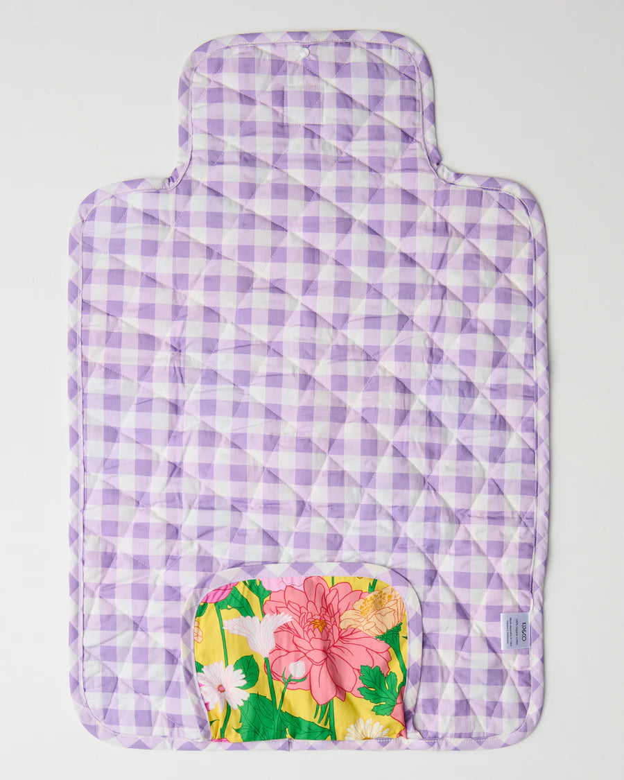 Our Follow The Sun Yellow Baby Change Mat is your on-the-go lifesaver, soft, quilted, and easy on the eyes. Made for quick changes wherever you roam, it folds up nice and neat to stash in your baby bag, pram, or car. Travel friendly and fuss-free! Made with organic cotton canvas, this mat has an outer featuring illustrated flowers in shades of pink, orange and cornflower blue with little bees and lady beetles on a sunshine yellow base, with a lilac and white gingham inner.