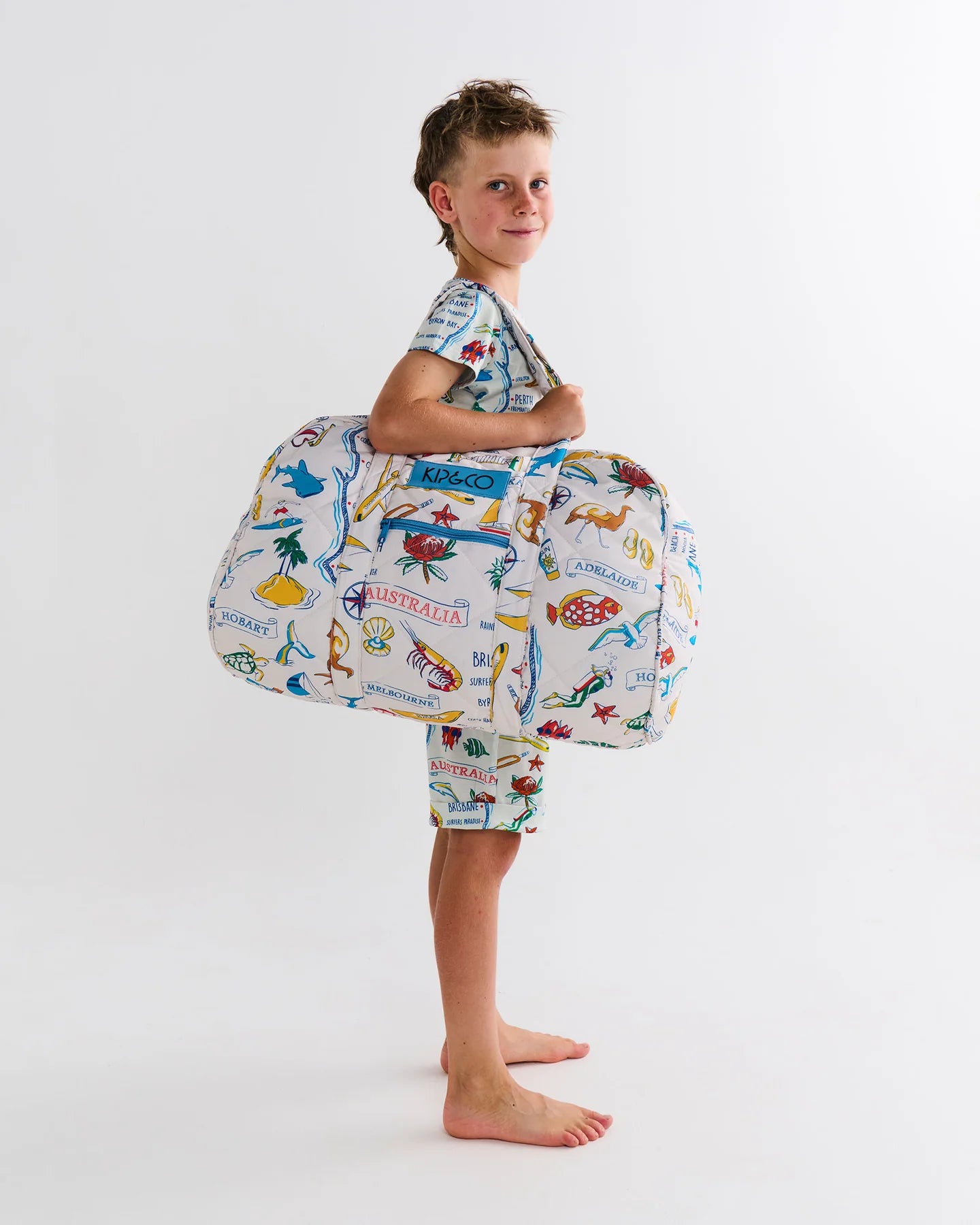 Say hello to your new go-anywhere, carry-everything sidekick! Our printed Aussie Road Trip Duffle Bag is made from a quilted recycled ripstop nylon, making it lightweight yet tough enough for every adventure. Big on space, easy to sling over your shoulder, and covered in signature Kip&Co colour, it’s the perfect partner for sunny escapes and everyday hauls alike. Featuring famous sights and Aussie delights on a white base. Please Note: The branding on this bag is smaller than pictured.