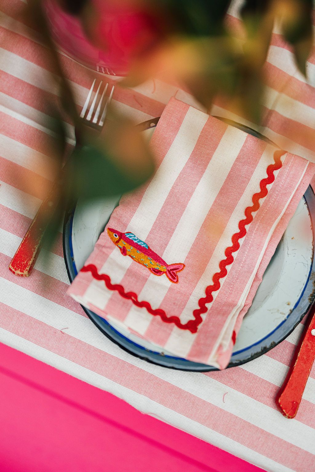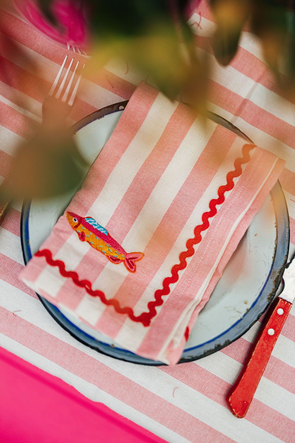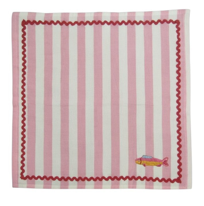 Soft, playful and full of seaside charm, the Harbour Stripe Embroidered Napkin Set in pink adds a cheerful touch to any table. Made from soft cotton with classic pink stripes, each napkin is finished with whimsical embroidered fish details and contrast ric rac trim for a relaxed coastal feel.