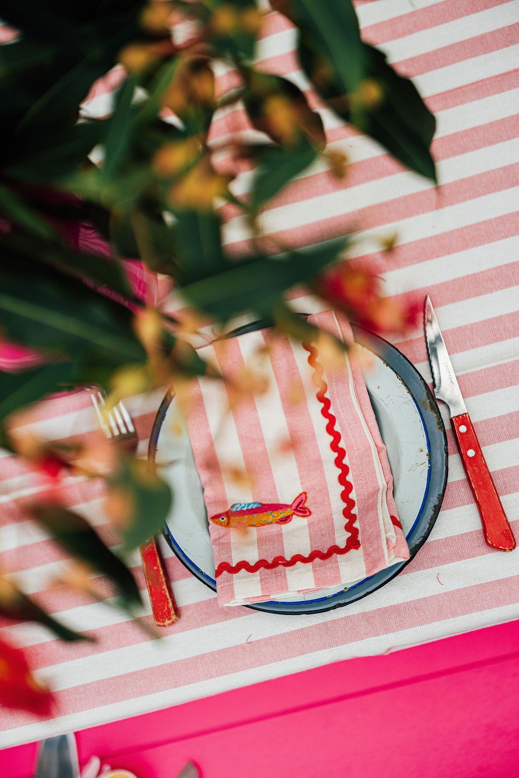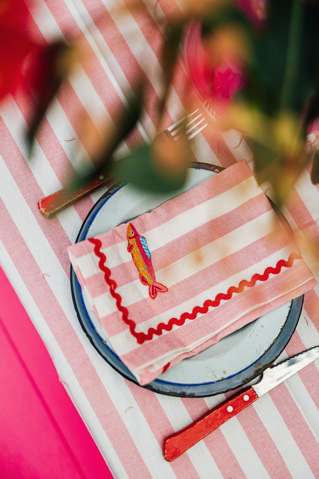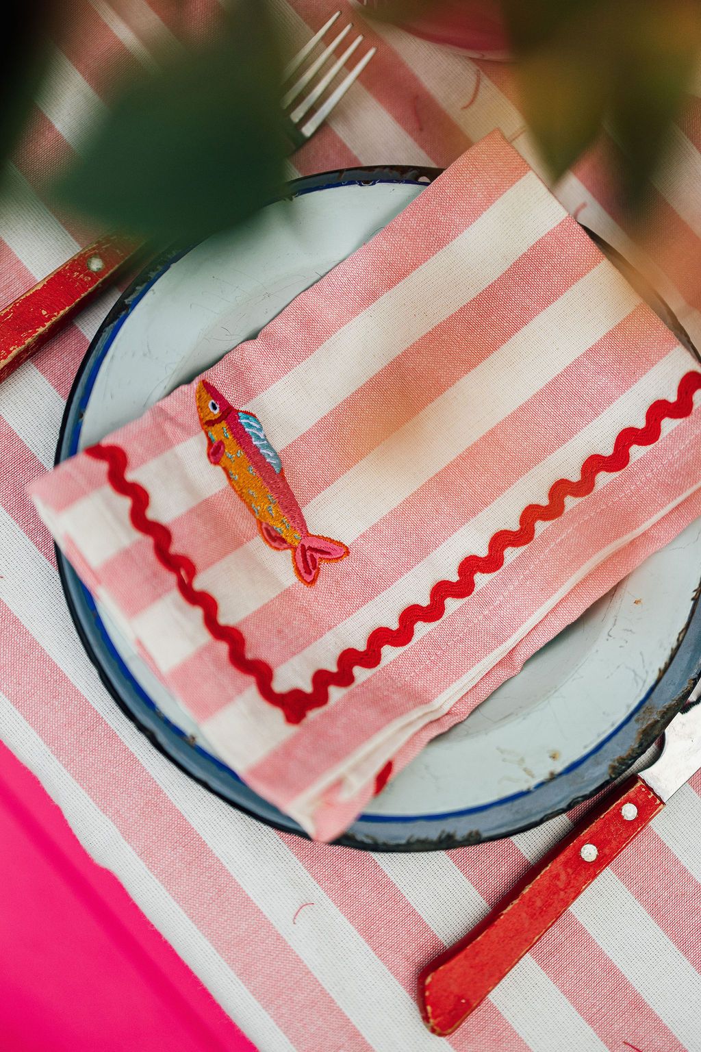 Soft, playful and full of seaside charm, the Harbour Stripe Embroidered Napkin Set in pink adds a cheerful touch to any table. Made from soft cotton with classic pink stripes, each napkin is finished with whimsical embroidered fish details and contrast ric rac trim for a relaxed coastal feel.
