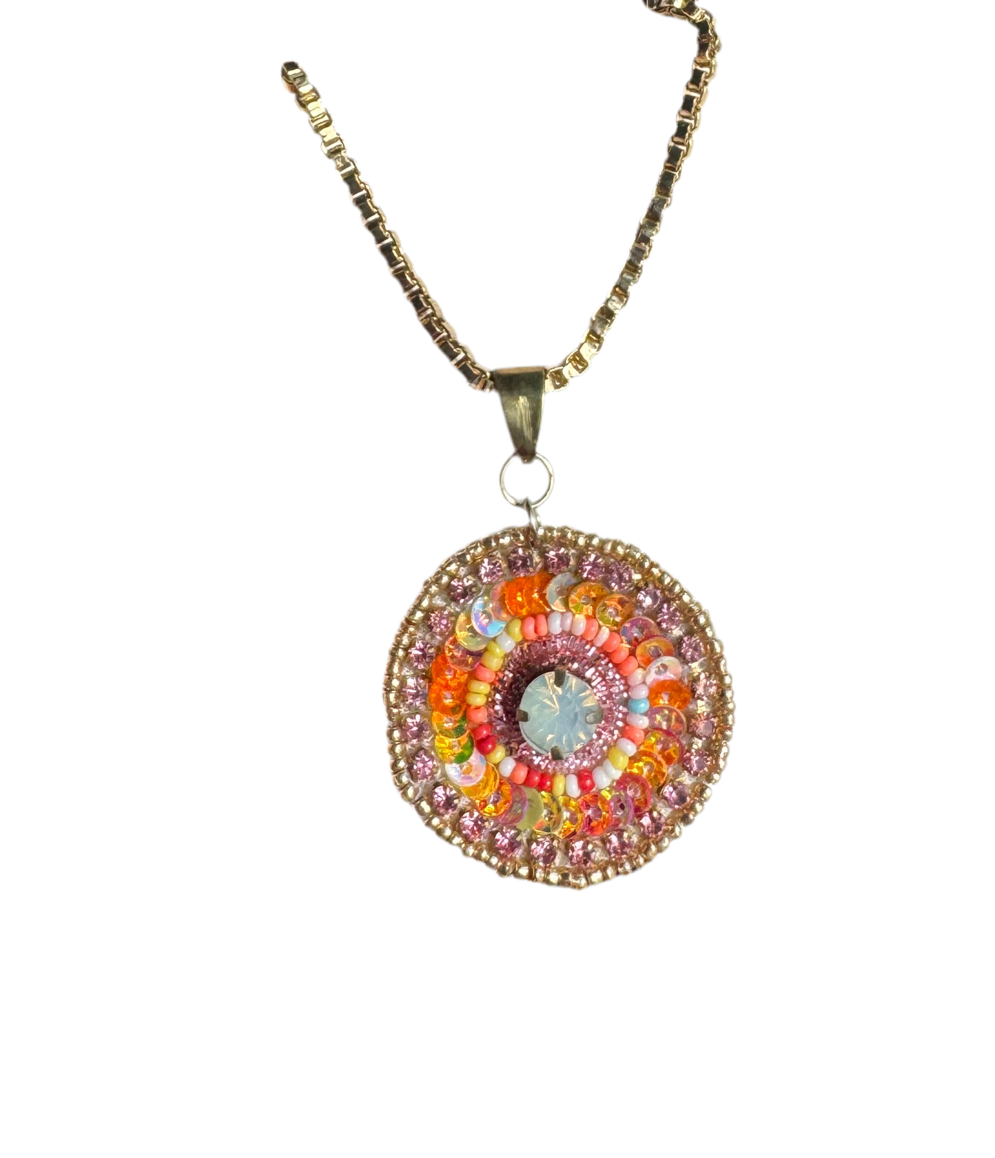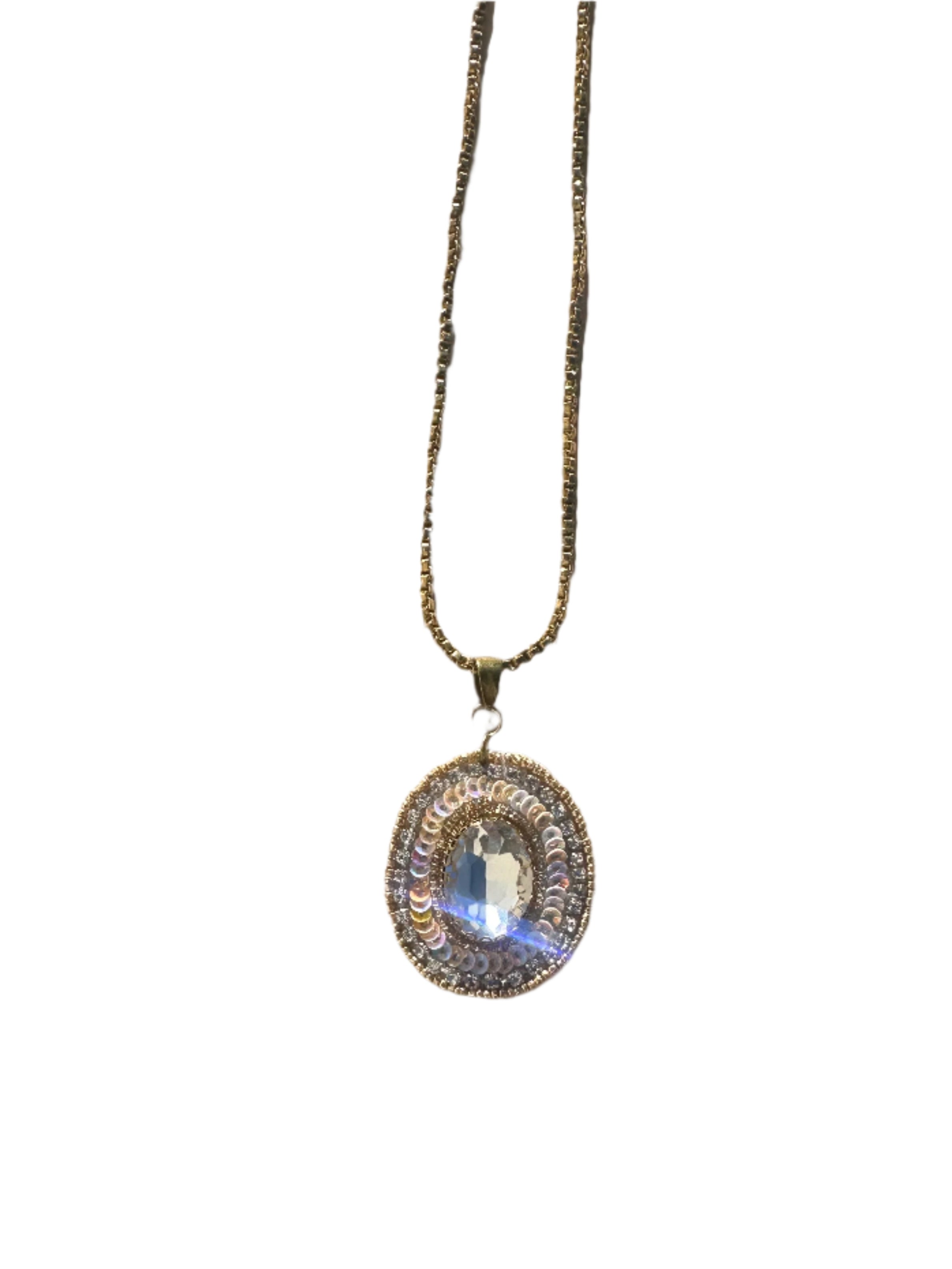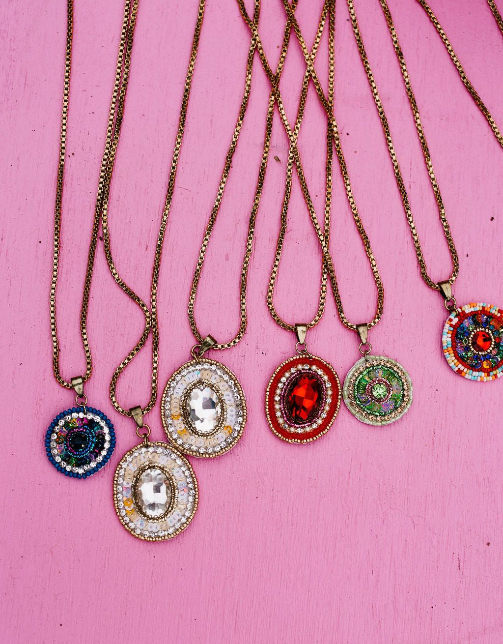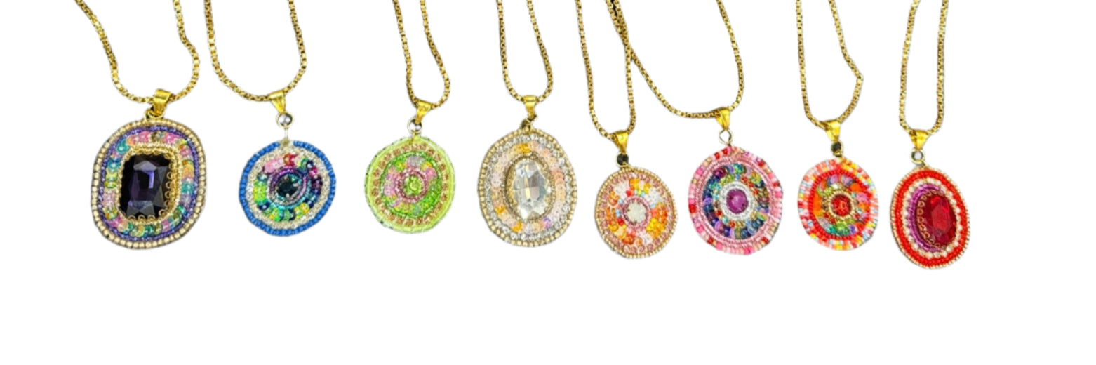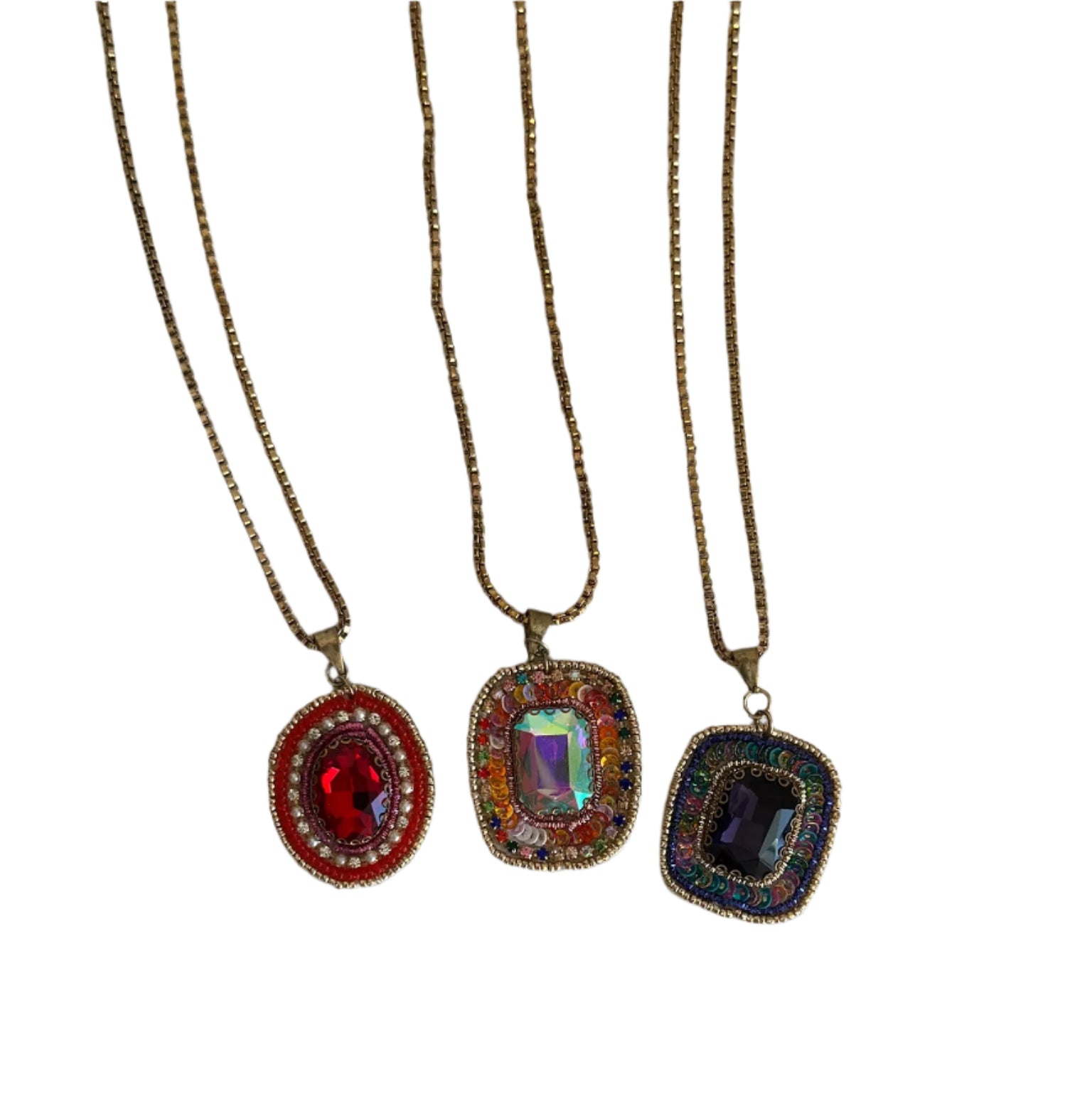 Our Beaded Gem Necklace is a playful celebration of craftsmanship, handmade with intricate beads and shimmering sequins. Available in 8 charming styles, each necklace showcases a sparkling gemstone-like center that adds a pop of colour and shine. The gold-style chain measures 52cm, perfectly complementing pendants sized between 2.5 and 4.5cm. A delightful accessory to brighten up any look!