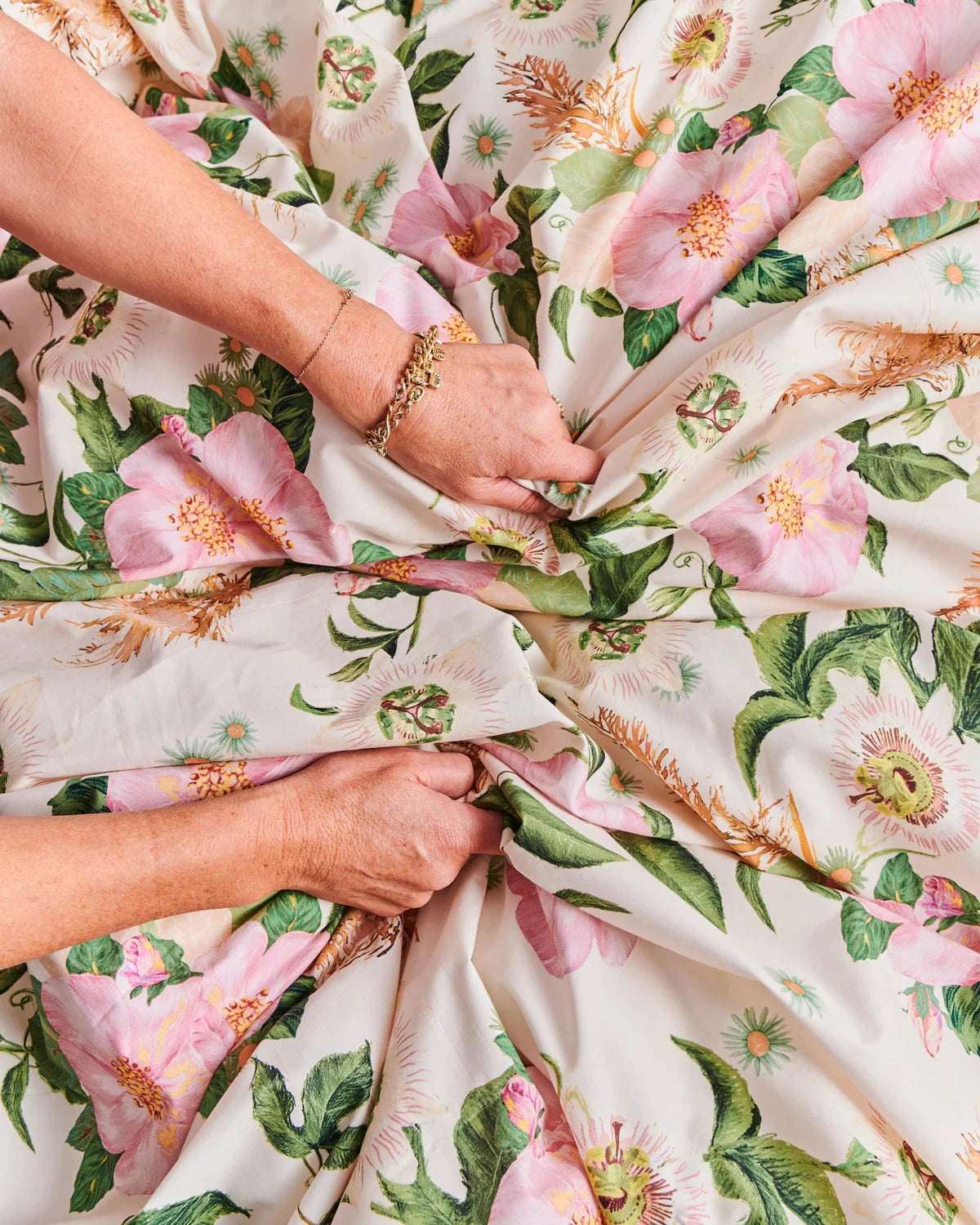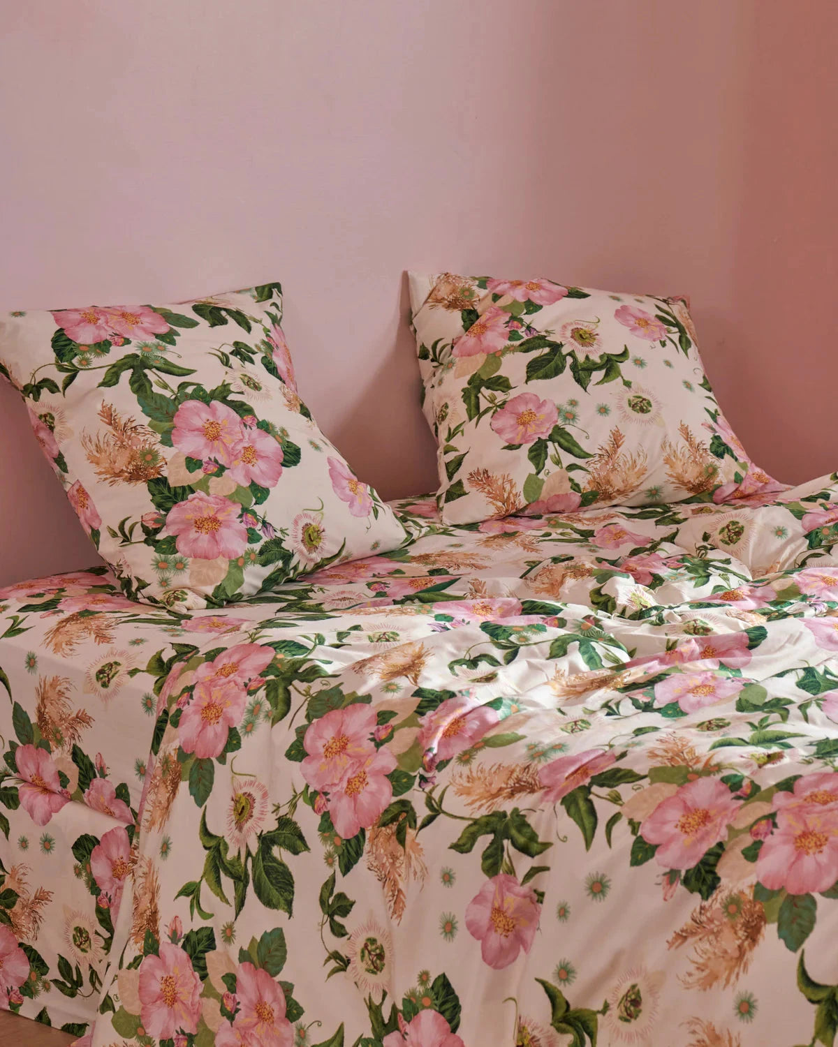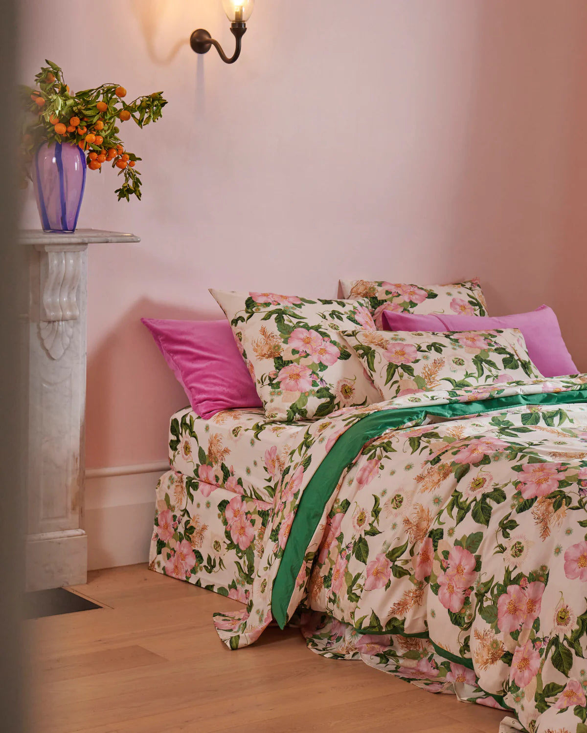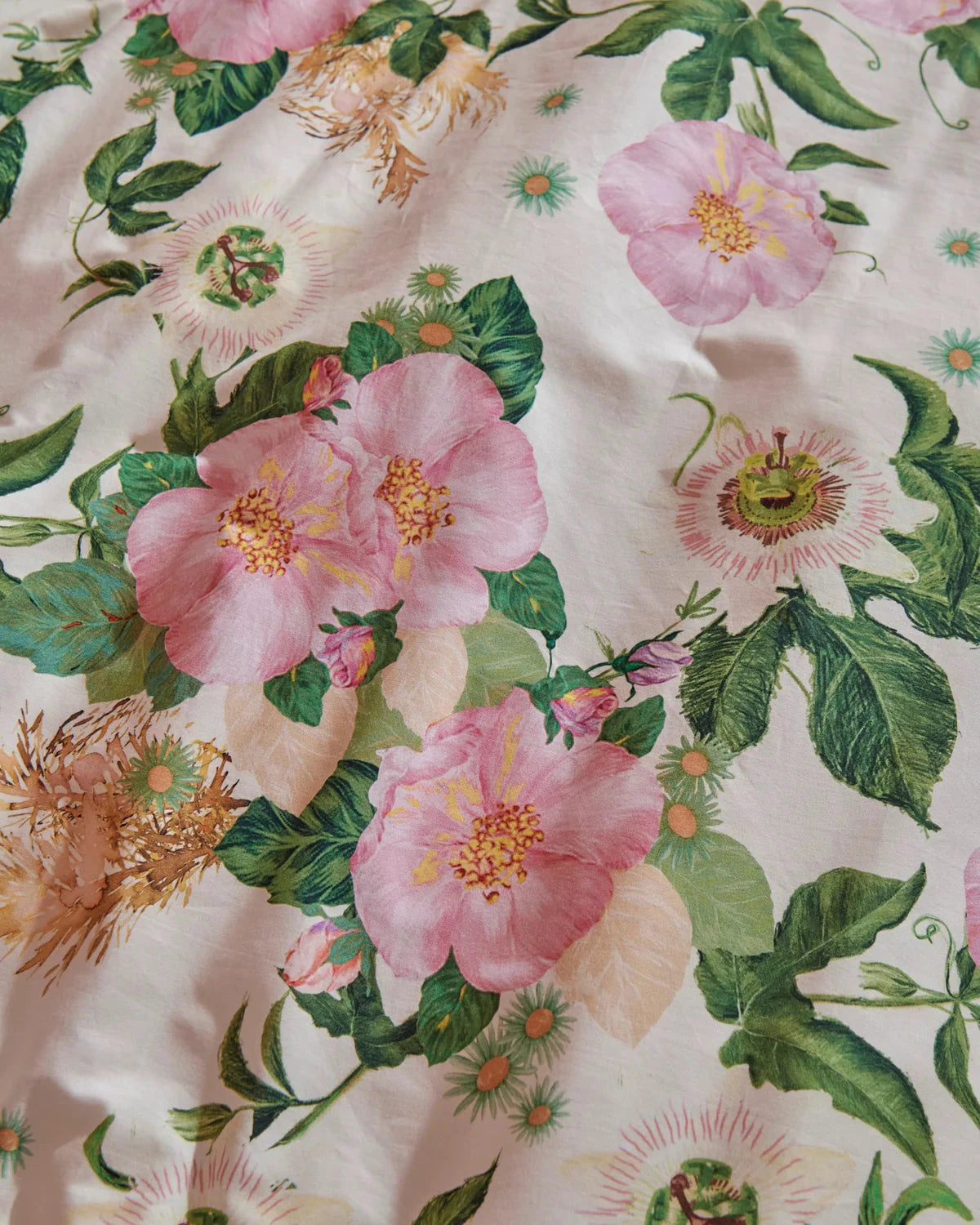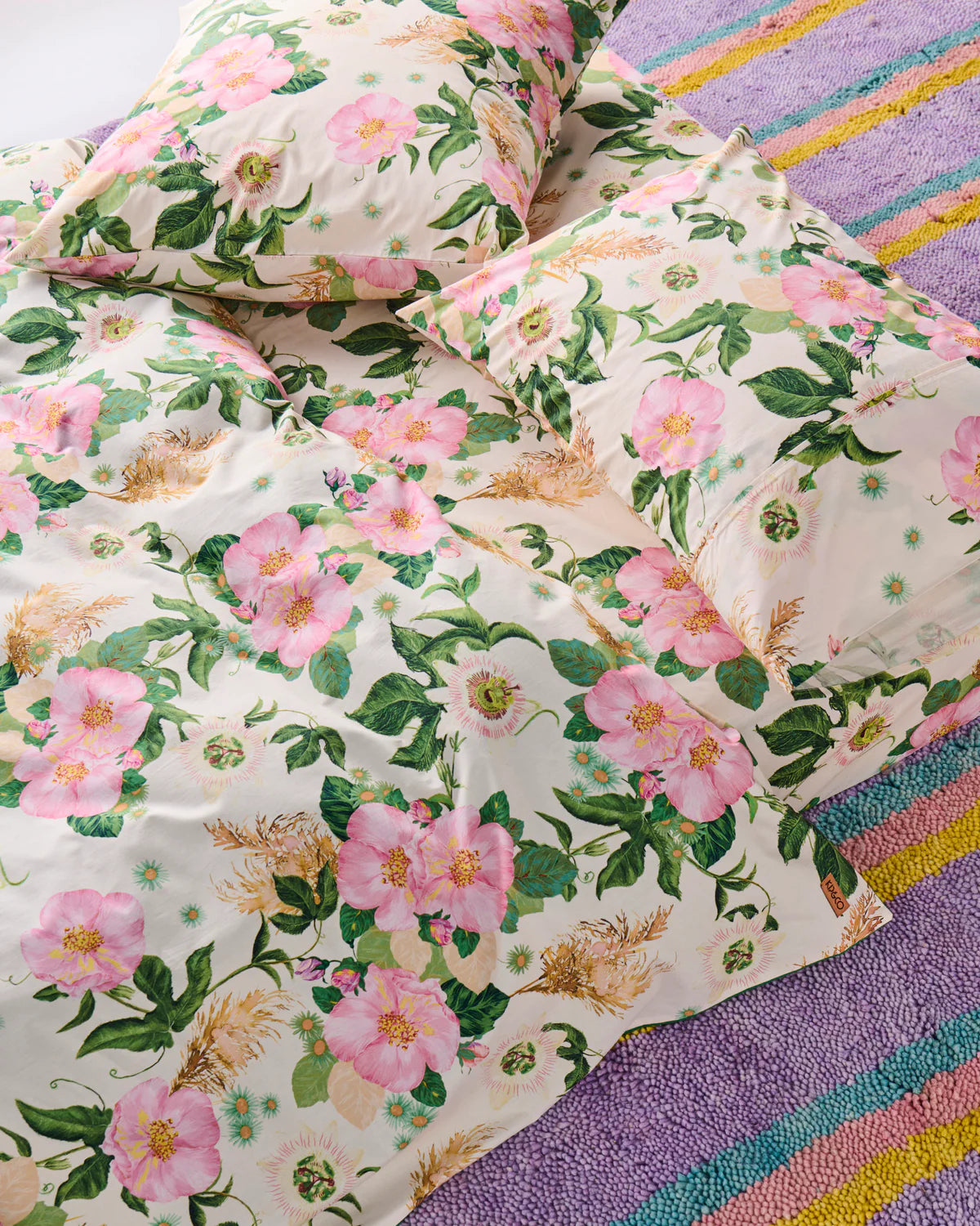 The Sunday Stroll Organic Cotton Quilt Cover captures the essence of a leisurely afternoon stroll, with a delightful print of blooming pink roses, creamy white passionflowers and lush greenery that brings the charm of a garden walk right into your home. With a plain deep green reverse, this quilt cover is made from 100% GOTS certified organic cotton, so you can snuggle up and rest easy knowing you're making a kind choice for both you and the planet. Pair with matching Sunday Stroll Organic Cotton Pillowcases or get creative and style with our range of block coloured cases.