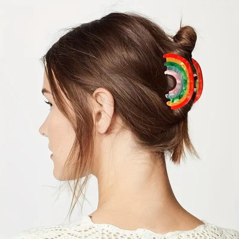 Add a pop of colour to your hair with our Rainbow Hair Clip! Made of durable and lightweight acrylic, this 4x7cm clip is perfect for adding a fun touch to any hairstyle. Stand out from the crowd with this playful accessory.